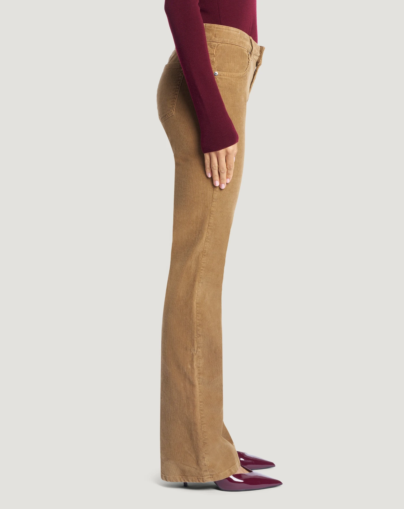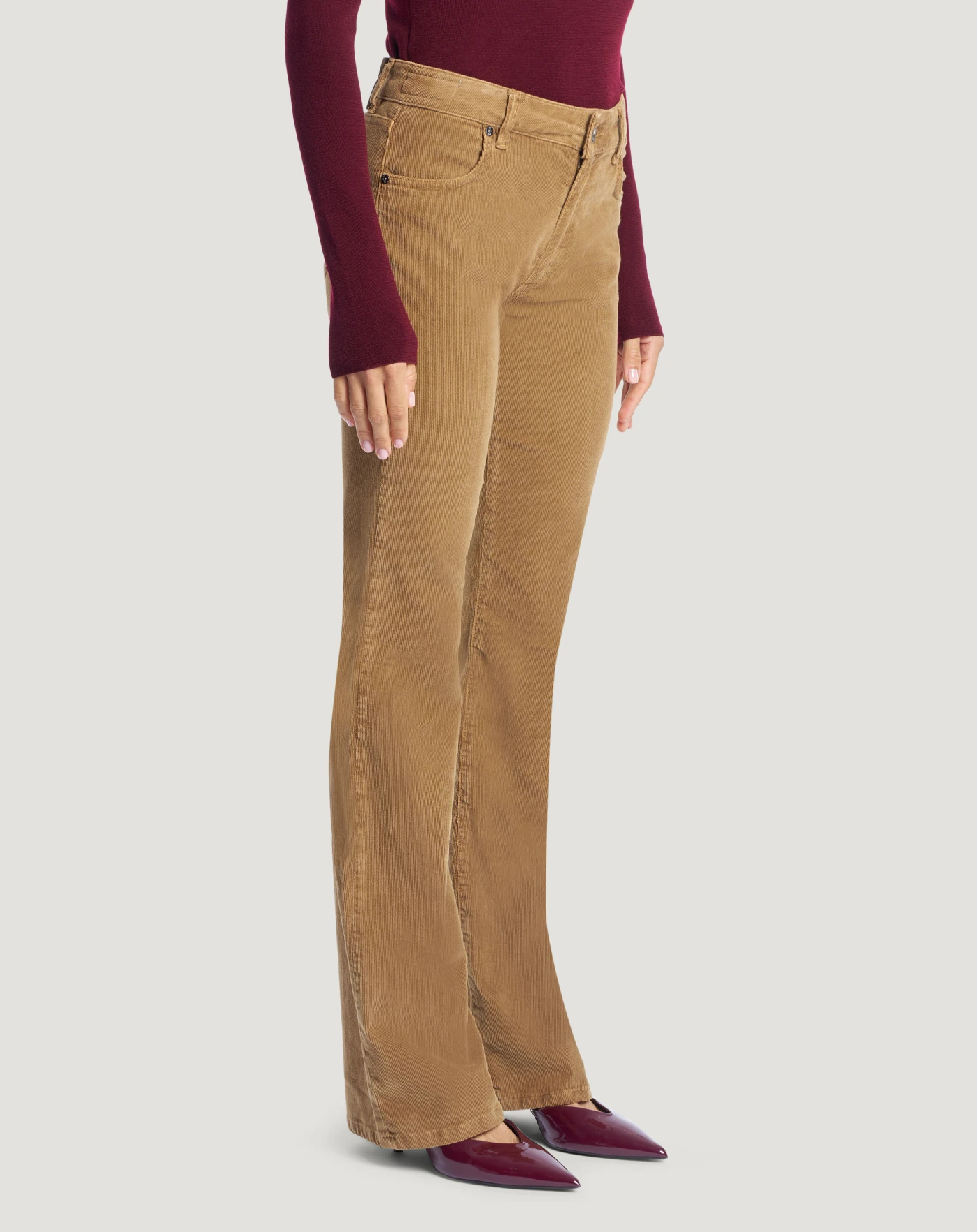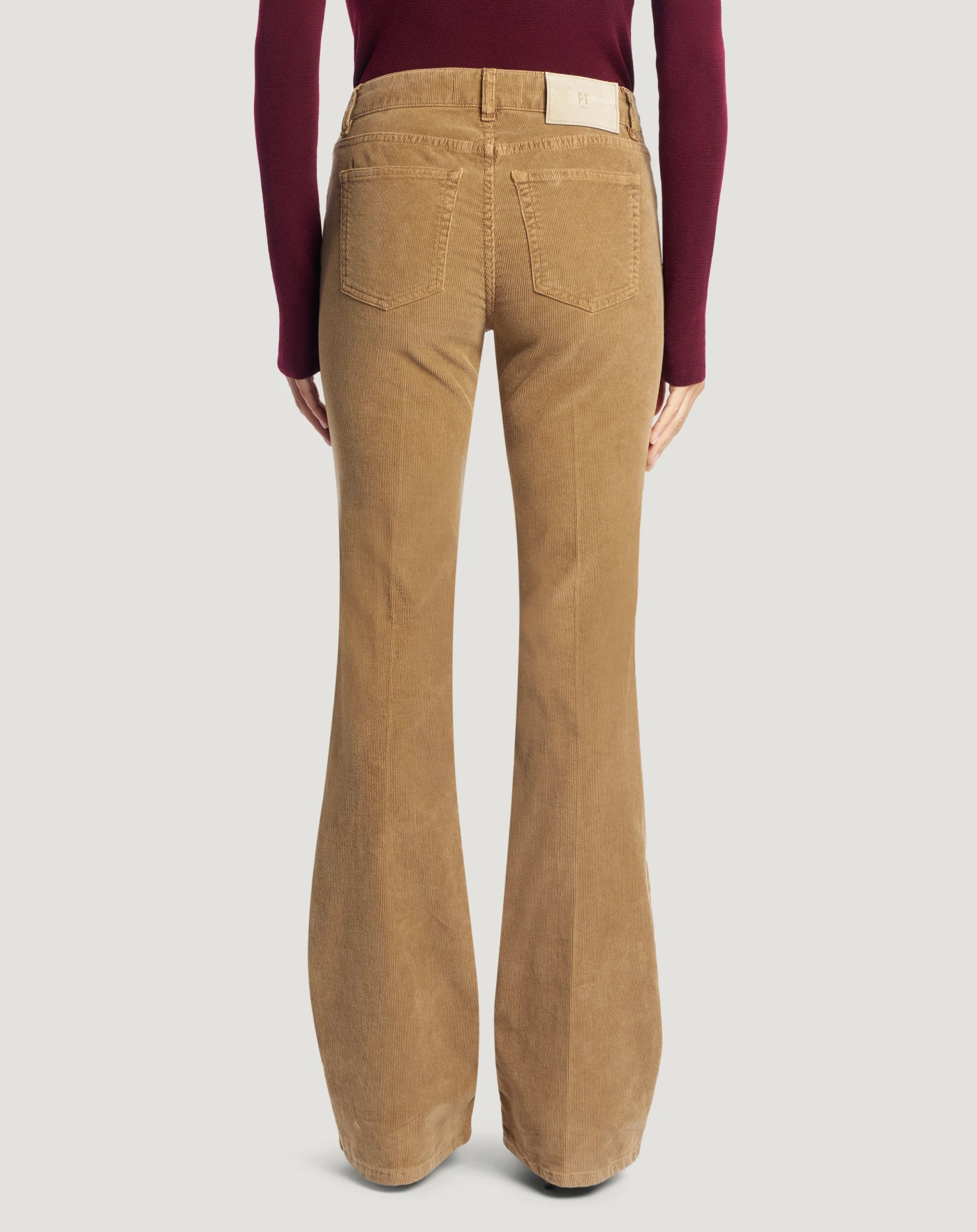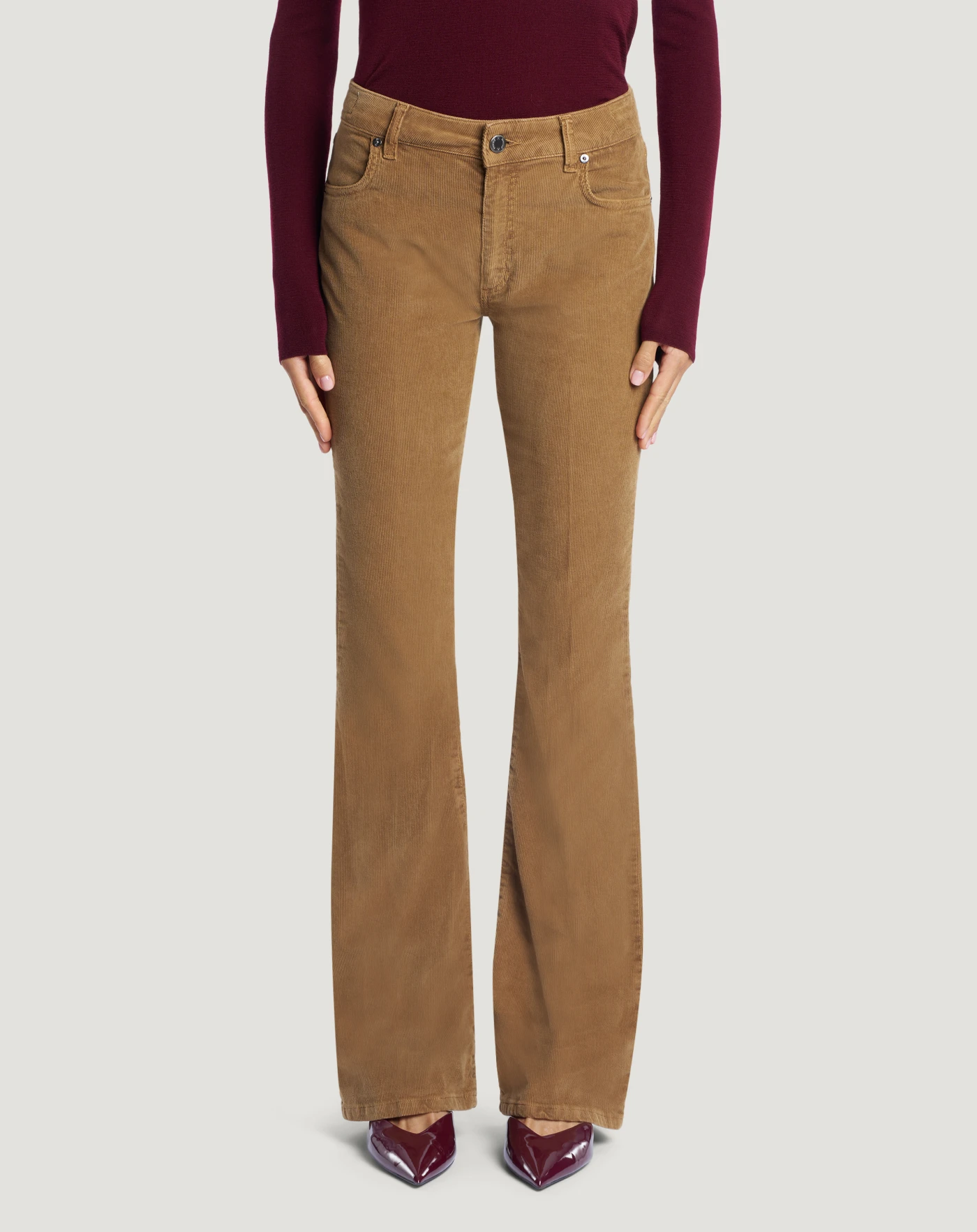 Pantaloni in velluto stretch di cotone con trama a costine sottili, un tessuto confortevole, caldo e perfetto per la stagione. Vita regular e linea flare per completare lo stile con un tocco attuale e décontracté. Scegli il marrone per dare intensità allo stile.