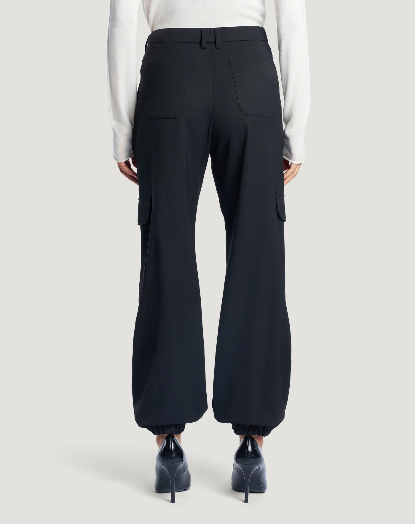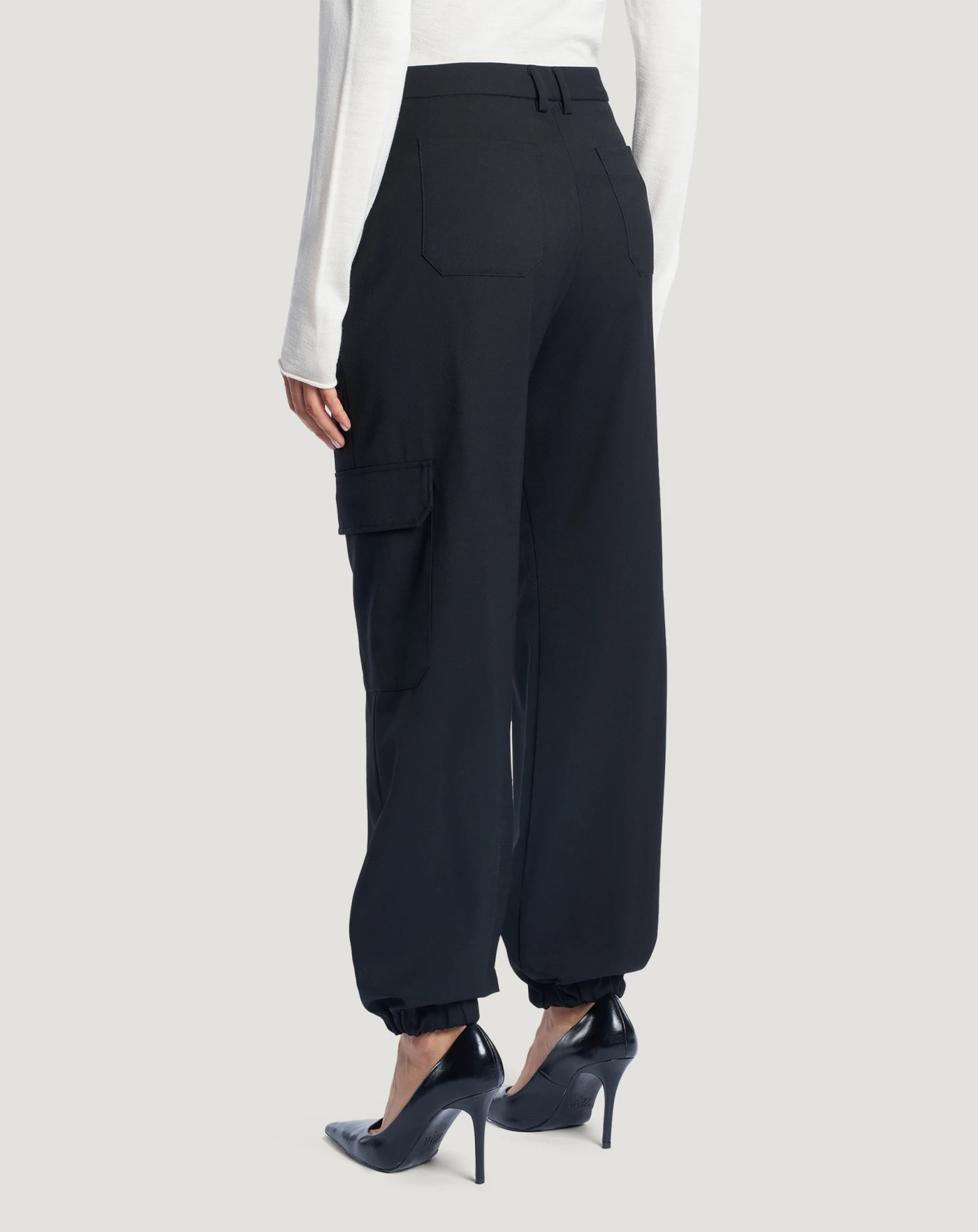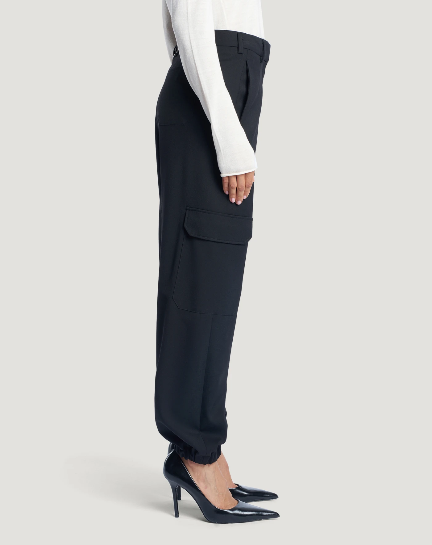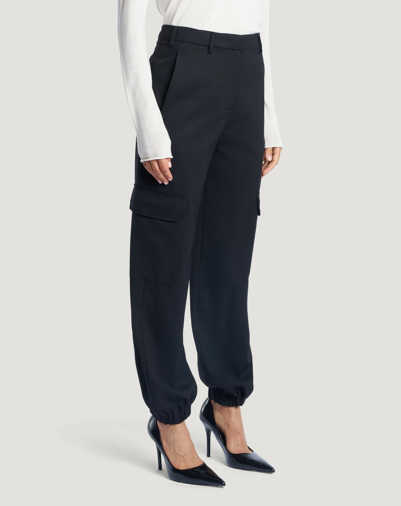 Pantaloni in lana b-stretch techno washable, un tessuto caldo, resistente e easy care. Hanno design cargo con linea regular, tasche laterali ed elastico ai fondi. Un modello attuale e perfetto per il quotidiano.