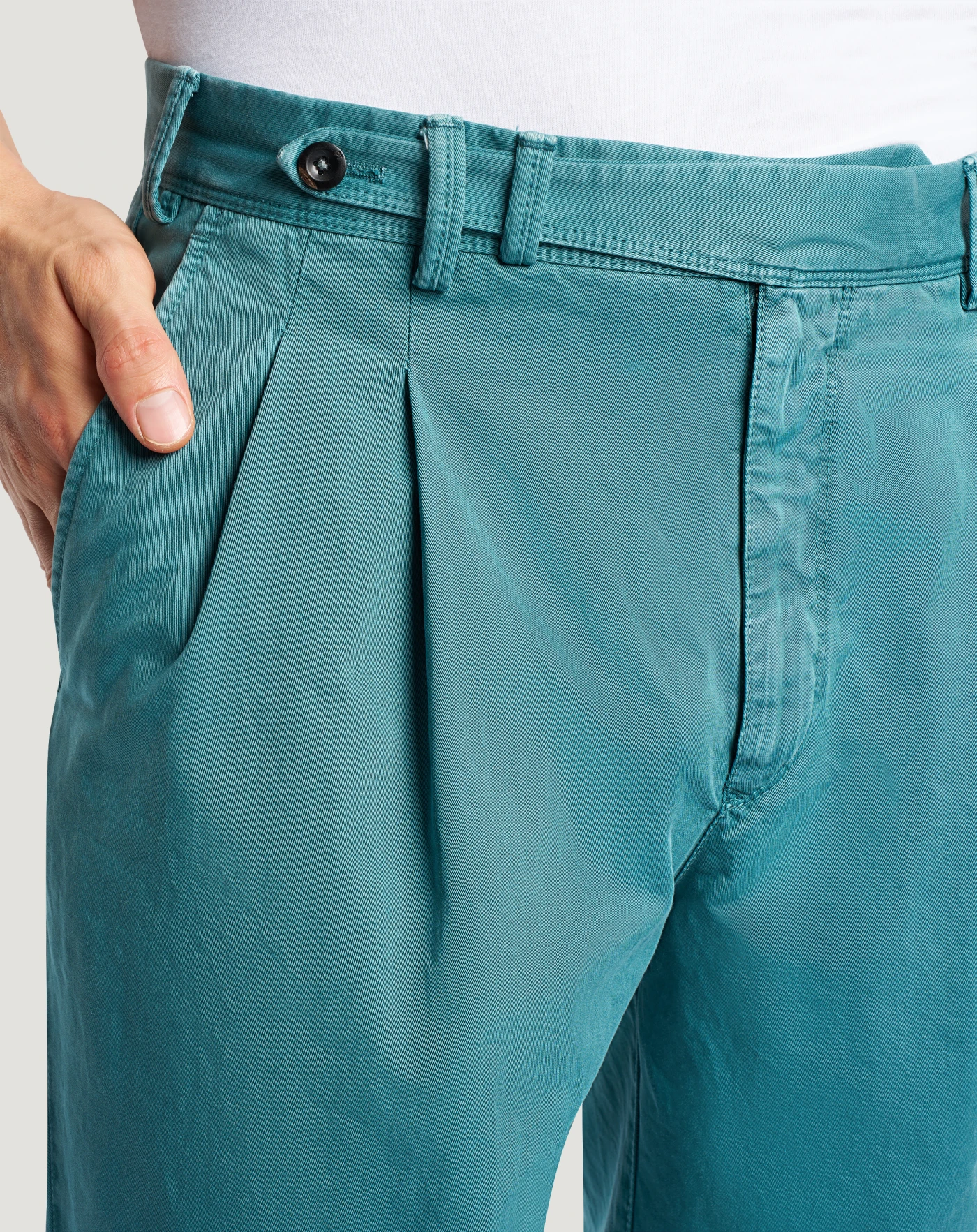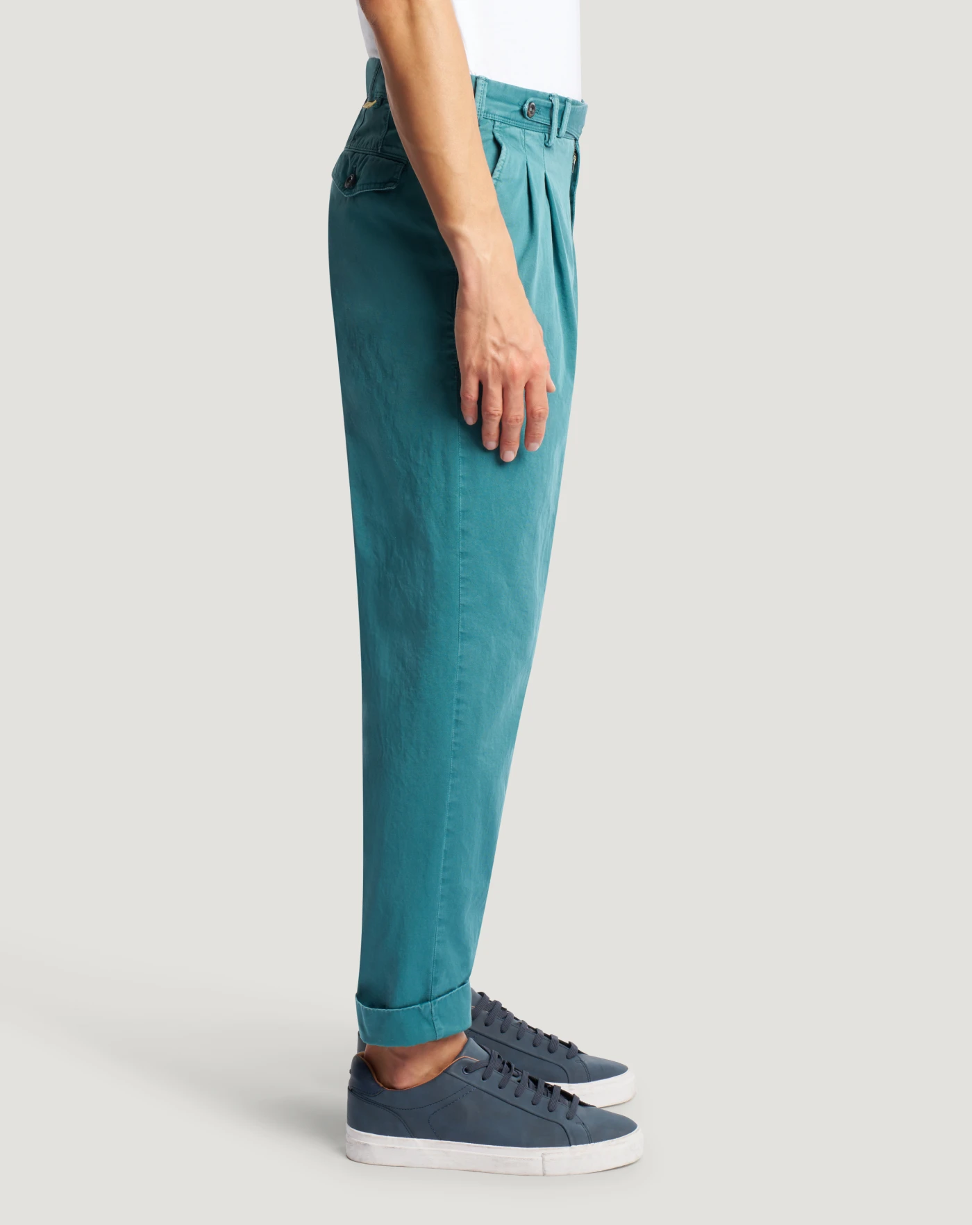 Vintage-inspired cotton chino trousers with a sophisticated character.With a double pleat at the front and turn-ups, they have a refined charm that turns a casual style on its head.