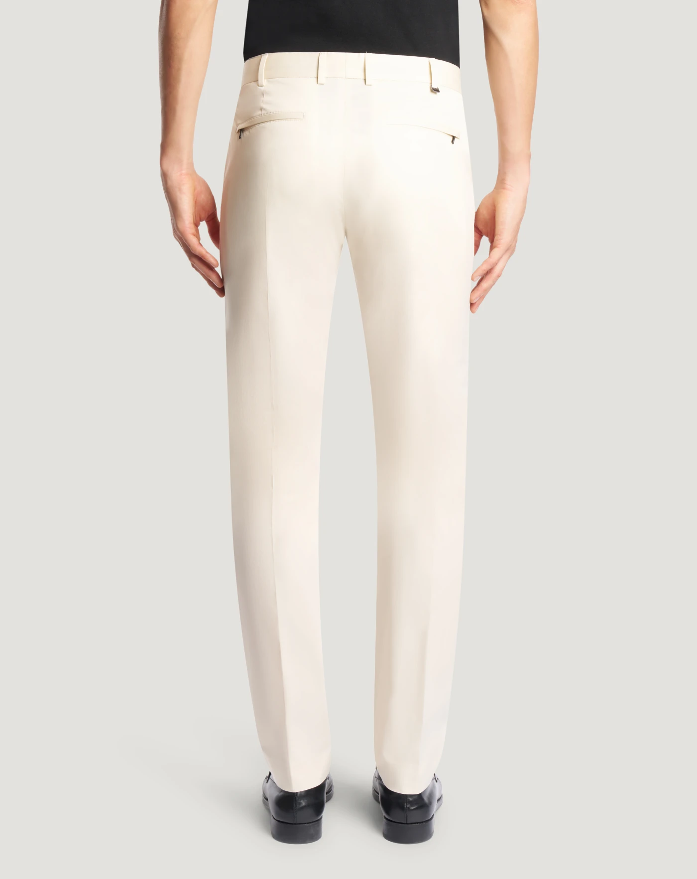 Trousers in techno cotton twill, a fabric featuring a compact diagonal structure and a stretch component that guarantees comfort and freedom of movement.Super-slim fit, smooth front and zip pockets at the back for an ankle-length tailored model with refined details.