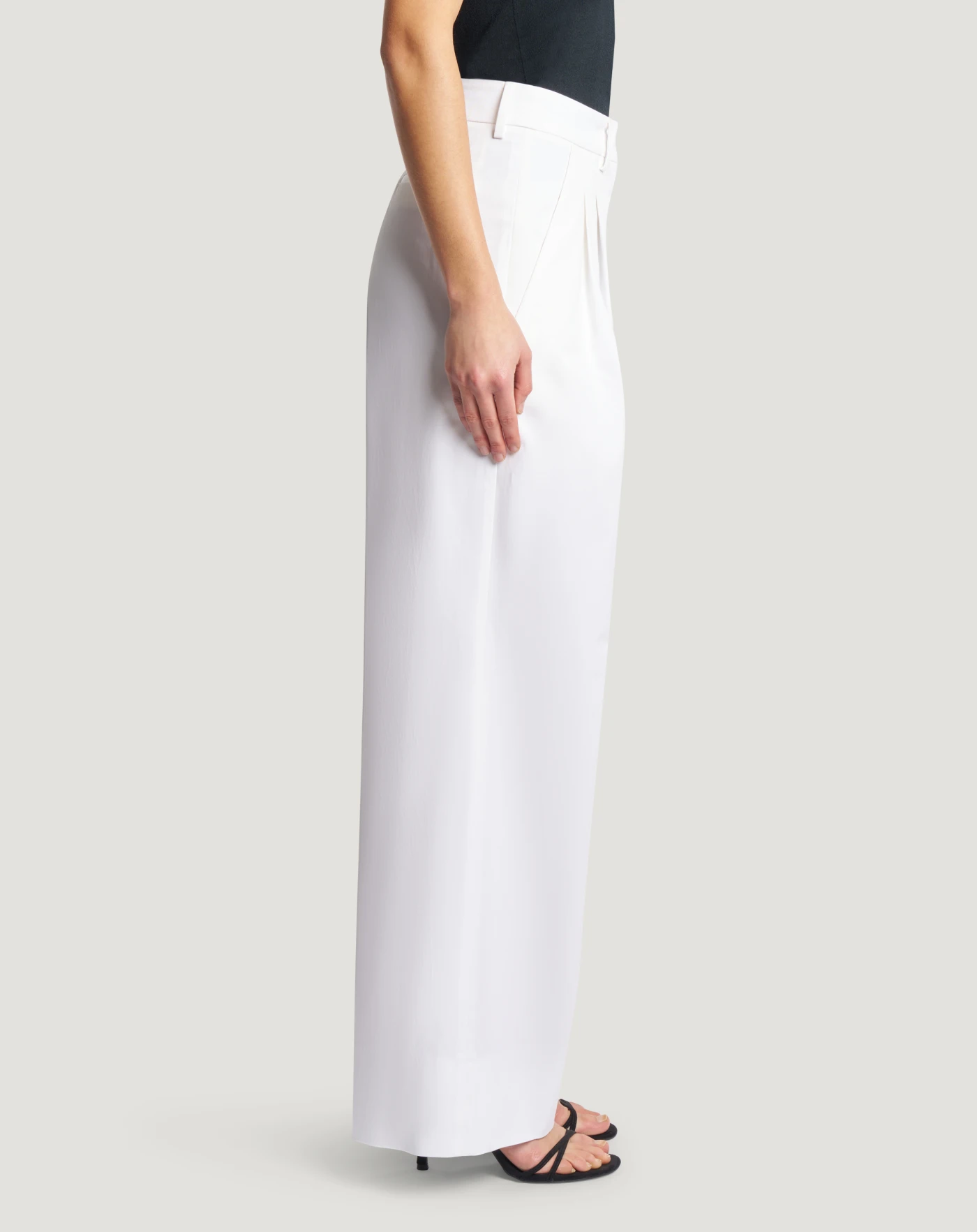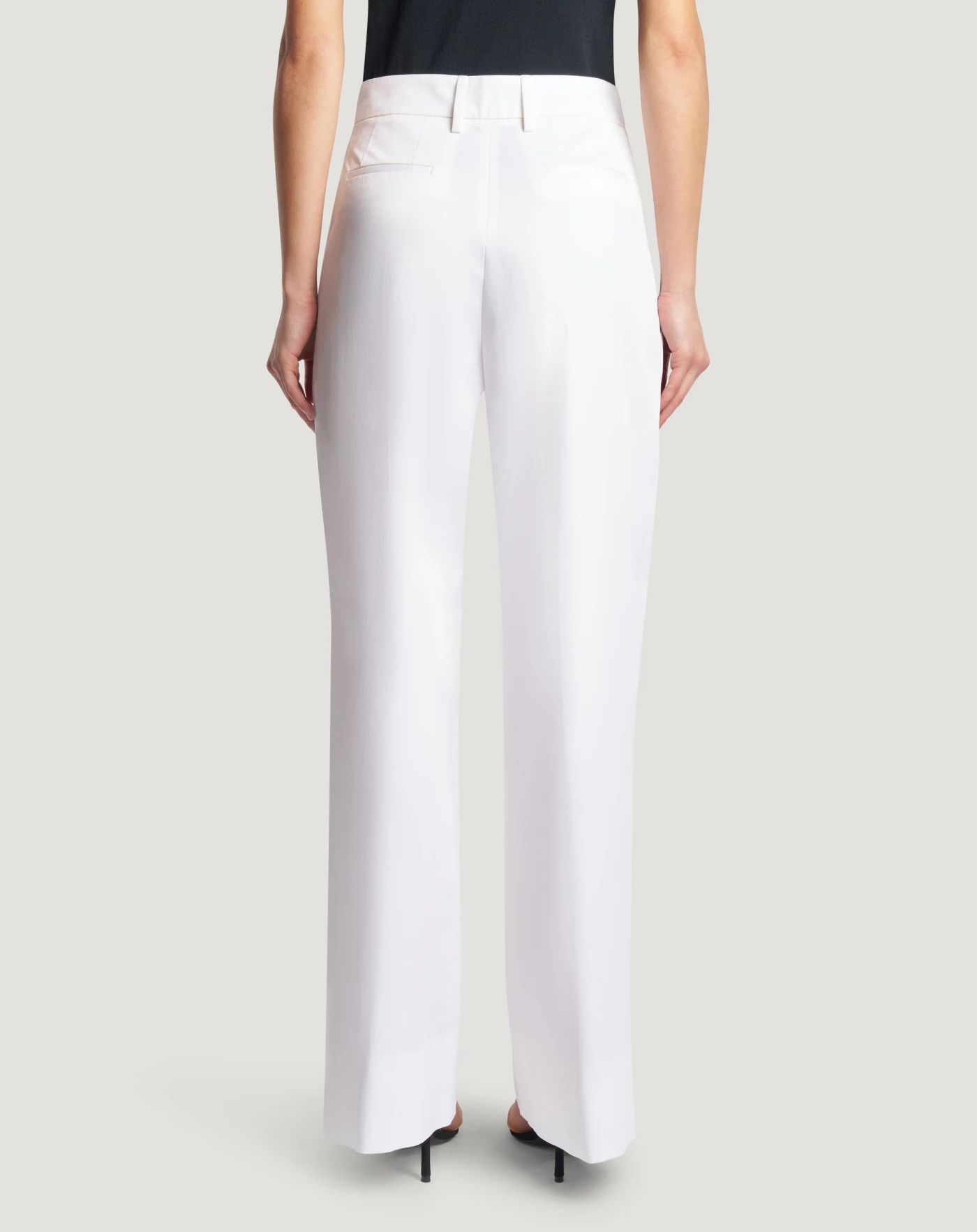 Trousers in stretch gabardine, a fabric with a very fine and compact diagonal weave featuring a clean, modern look. With a wide leg and two pleats in front, in the ice white variant their appeal is both refined and versatile.