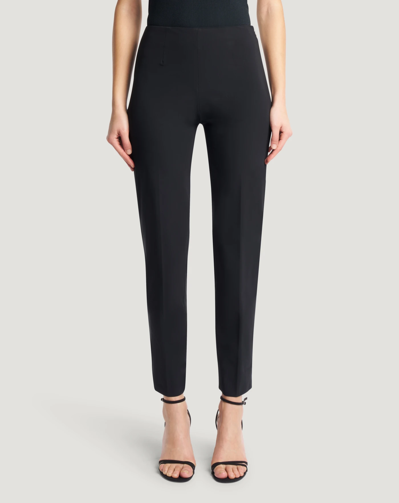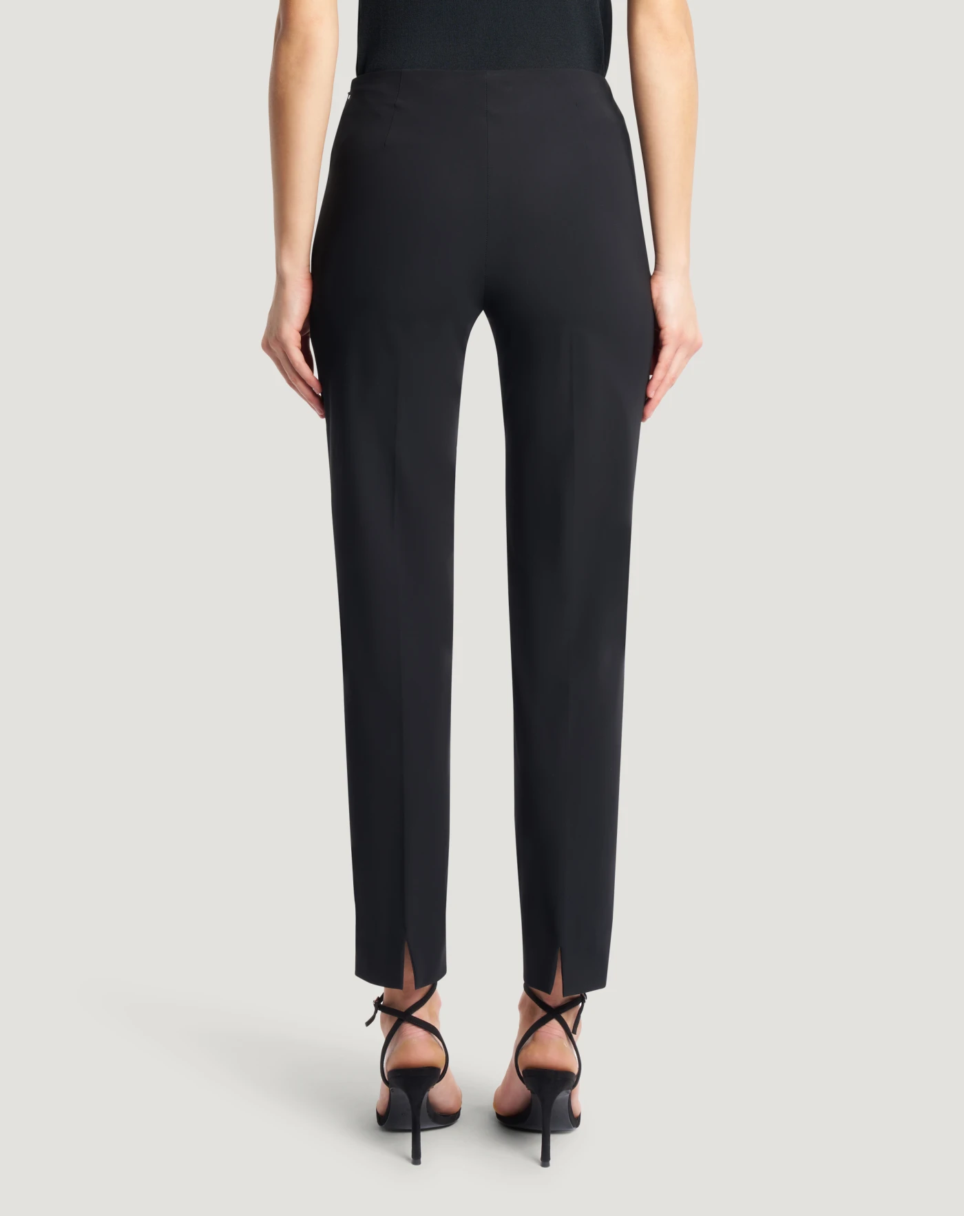 Trousers in stretch kinetic fabric, a high-performance summer material made with organic fibres and designed to offer natural elasticity and dynamic comfort. A skinny fit and side zip define your silhouette and complete a style with elegance. In black for a versatile model in your wardrobe.