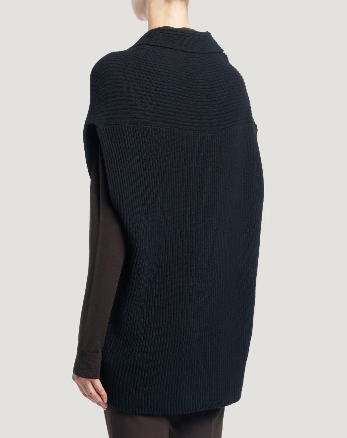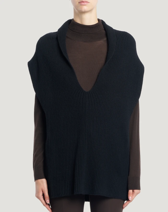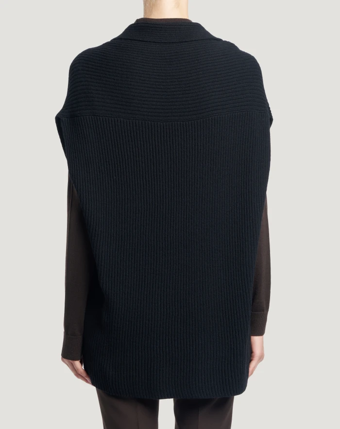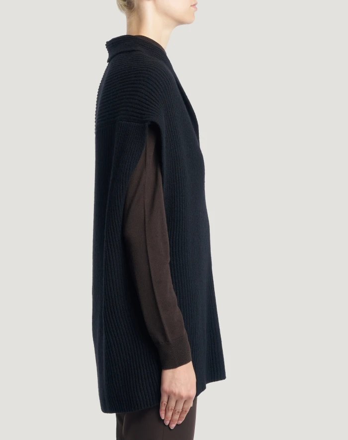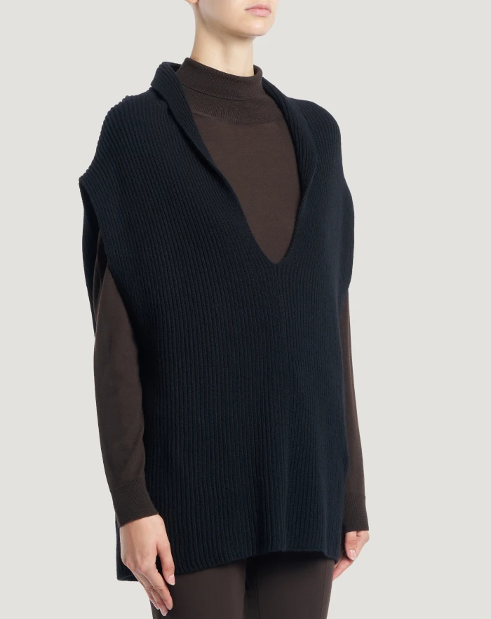 Fisherman’s rib jumper in wool and cashmere tricot, a soft and refined yarn.The relaxed vest-style cut makes it a versatile item in your wardrobe. Wear it in black to give your outfit an elegant touch.