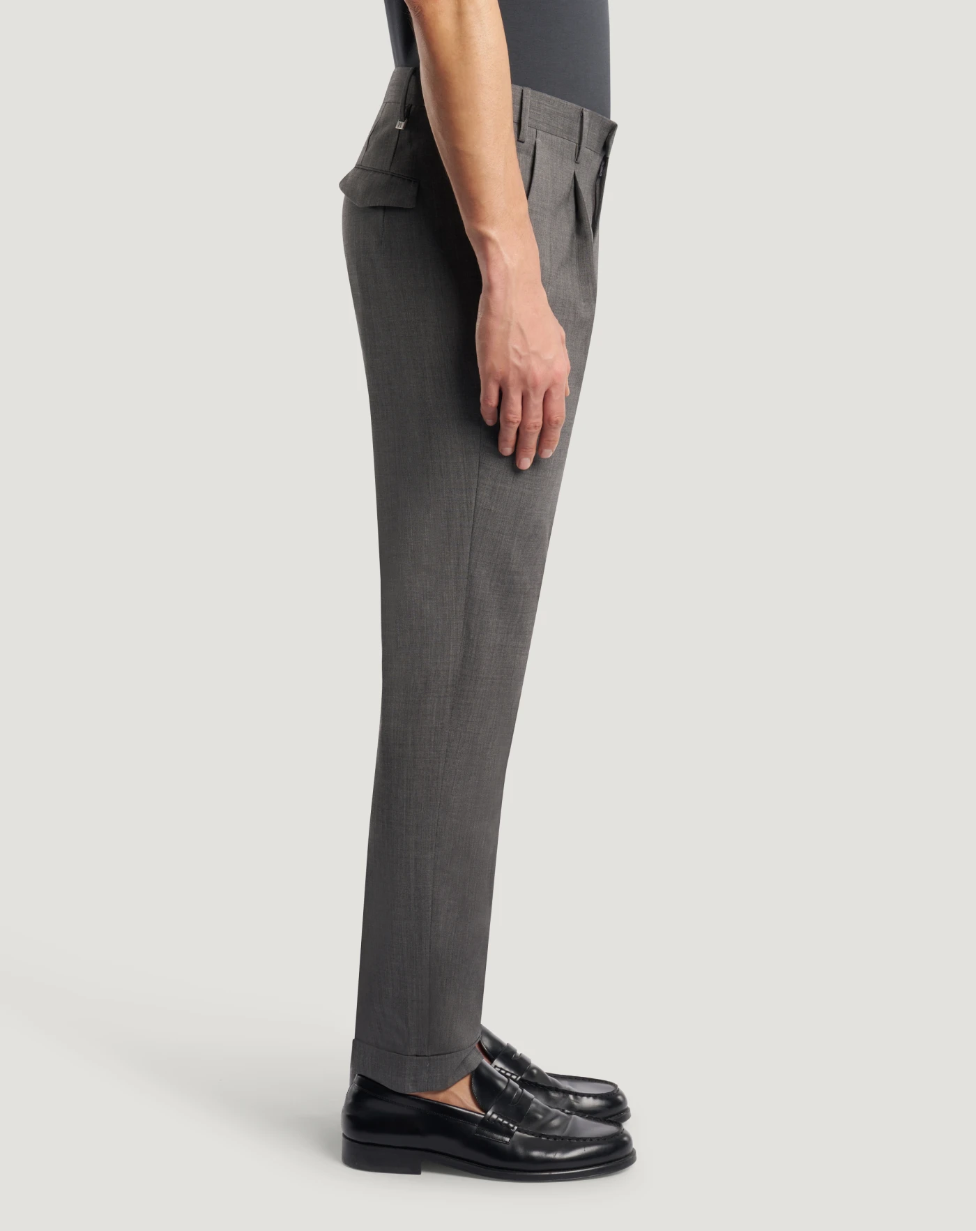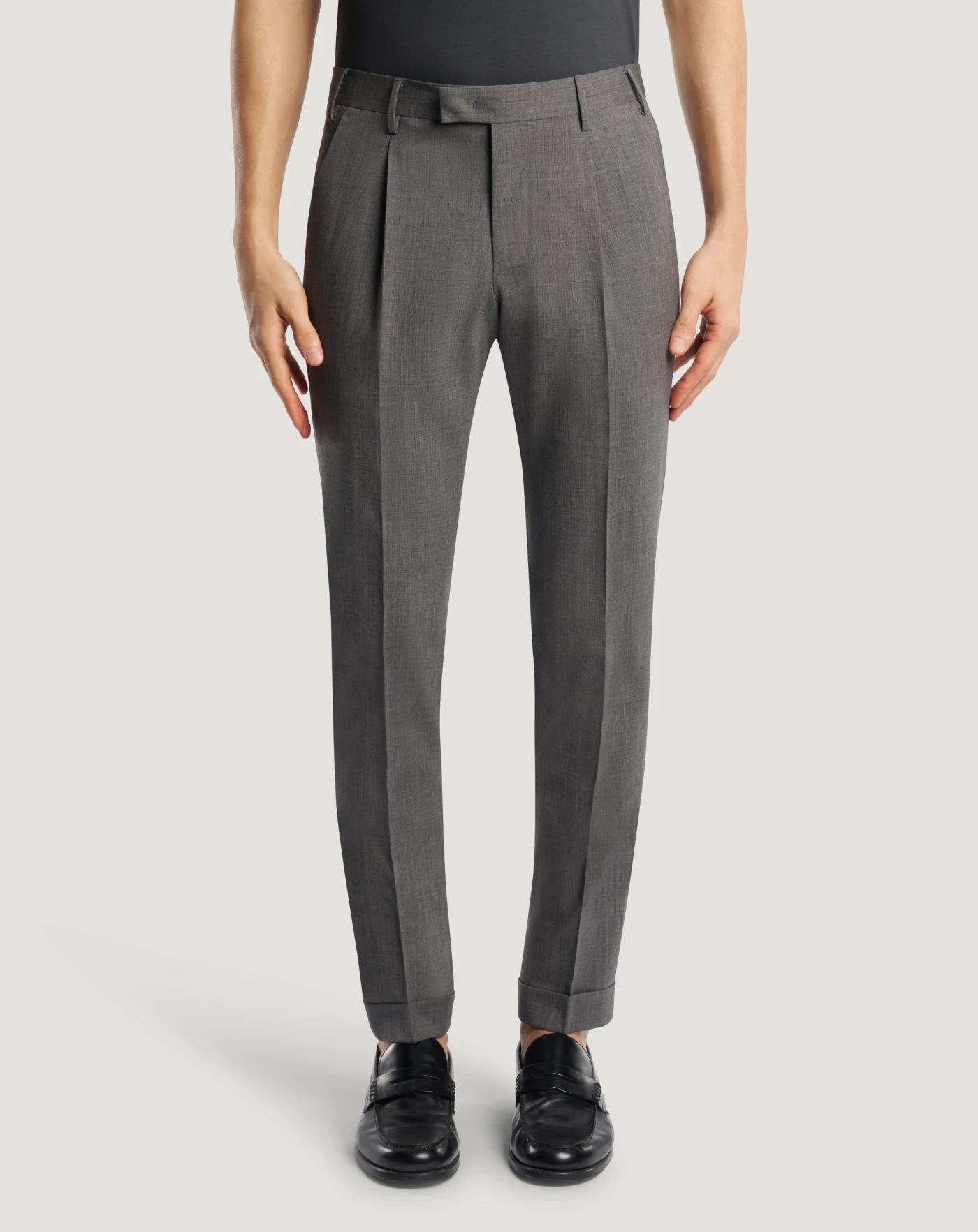Trousers in stretch wool, a versatile plain-weave fabric designed to be worn all year round thanks to its balance of lightness, stability and comfort.Featuring a smooth front, pressed pleat and turned-ups, these trousers boast a unique design. In the grey variant they will be the ideal match for your formal looks.