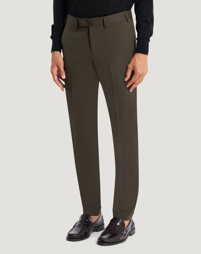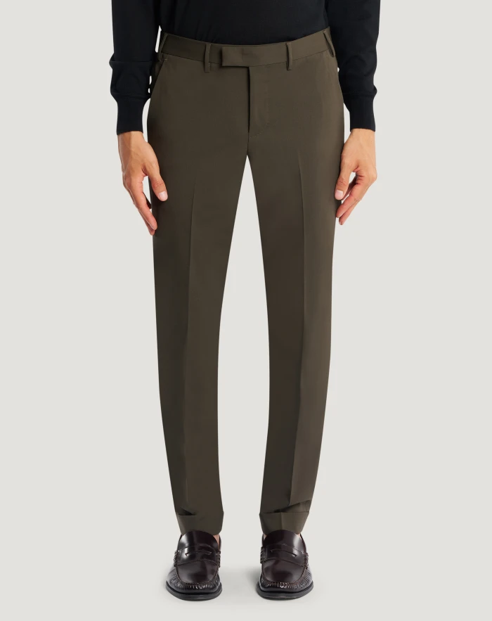 Trousers in bi-stretch batavia wool, a fabric distinguished by a stretch weave that adapts to the body’s movements, ensuring a look that is both elegant and comfortable yet light.Featuring a smooth front, ironed pleat and turned-up hem, these trousers boast a unique sartorial design. In military green to add character to casual and formal looks.