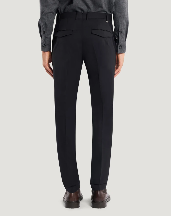 Trousers in bi-stretch batavia wool, a fabric distinguished by a stretch weave that adapts to the body’s movements, ensuring a look that is both elegant and comfortable yet light.Featuring a smooth front, ironed pleat and turned-up hem, these trousers boast a unique sartorial design.