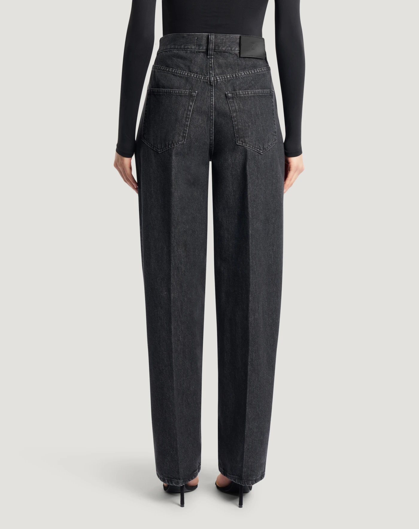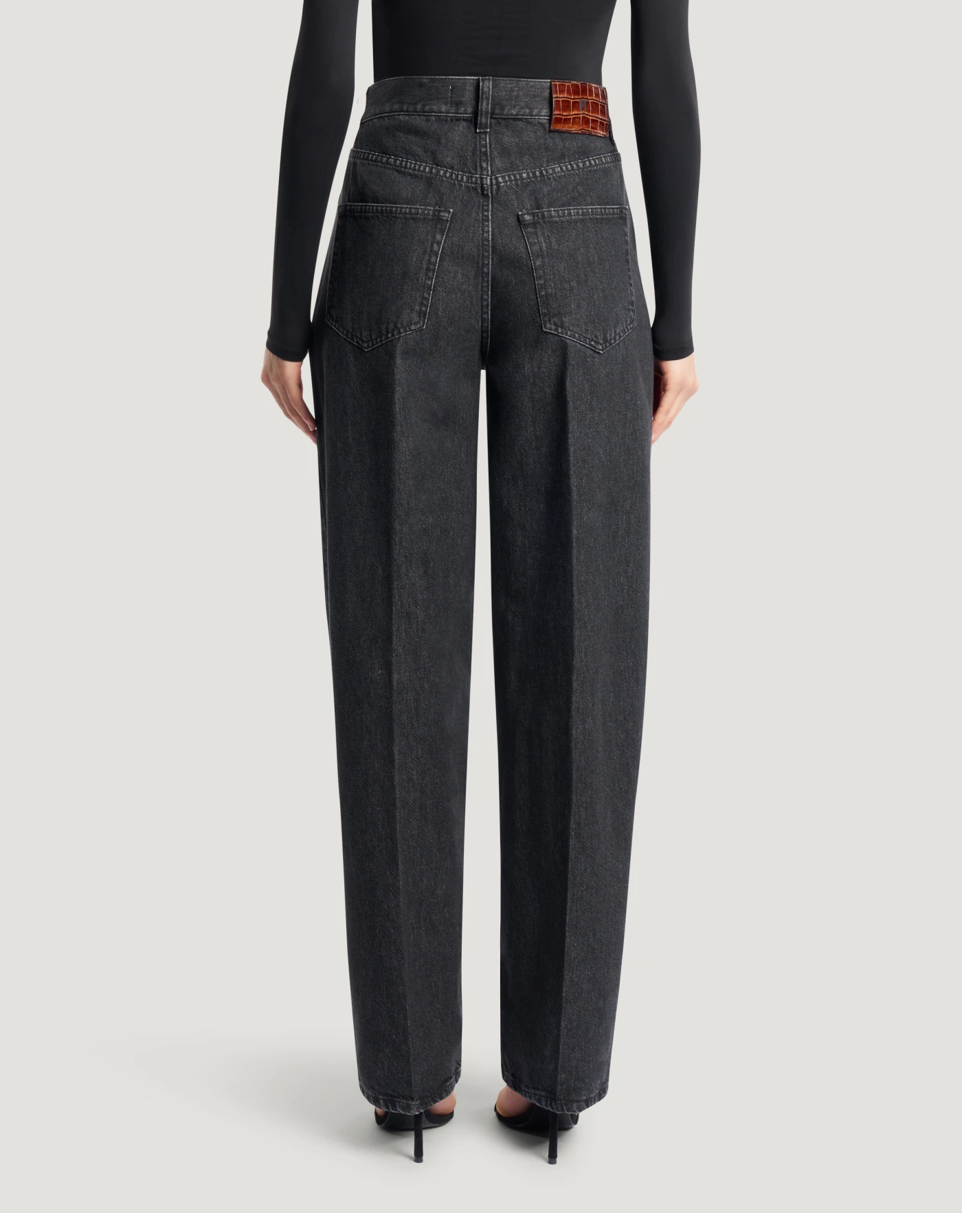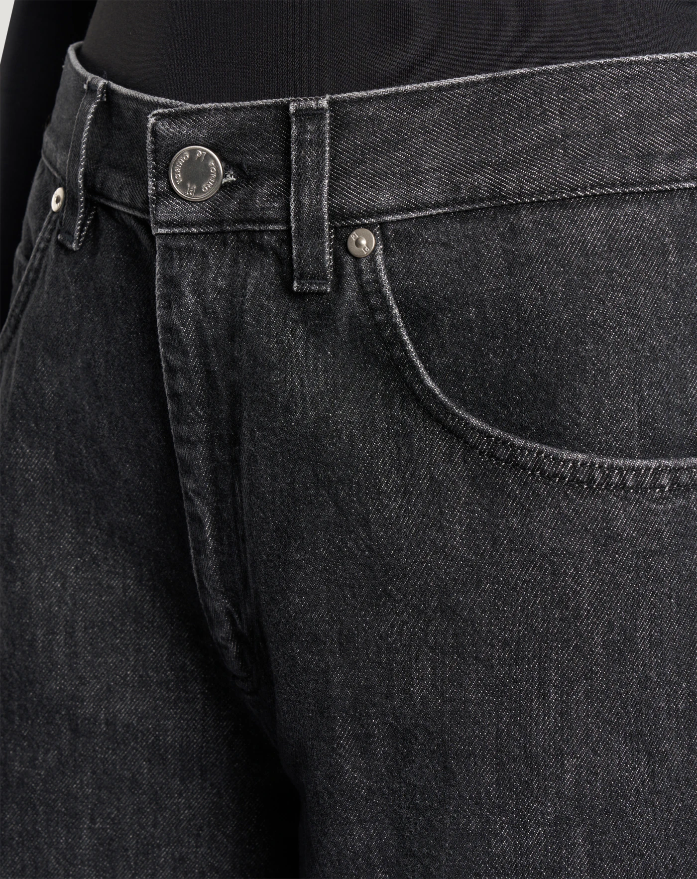 Jeans in black denim, a soft, comfortable, durable and firm fabric (12 oz) with an even, textured wash. A high waist, carrot fit and pressed crease, will add urban grit to your style.
