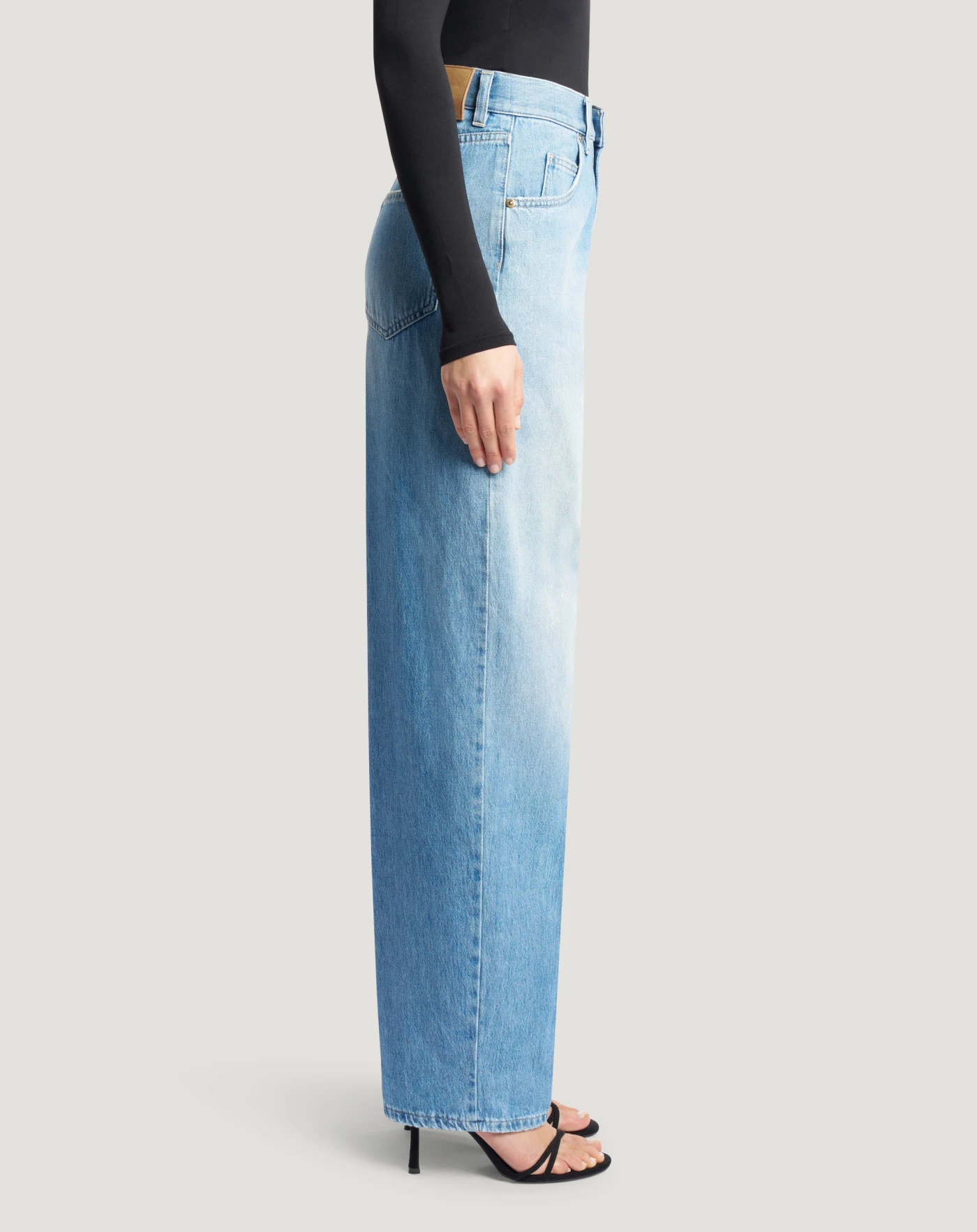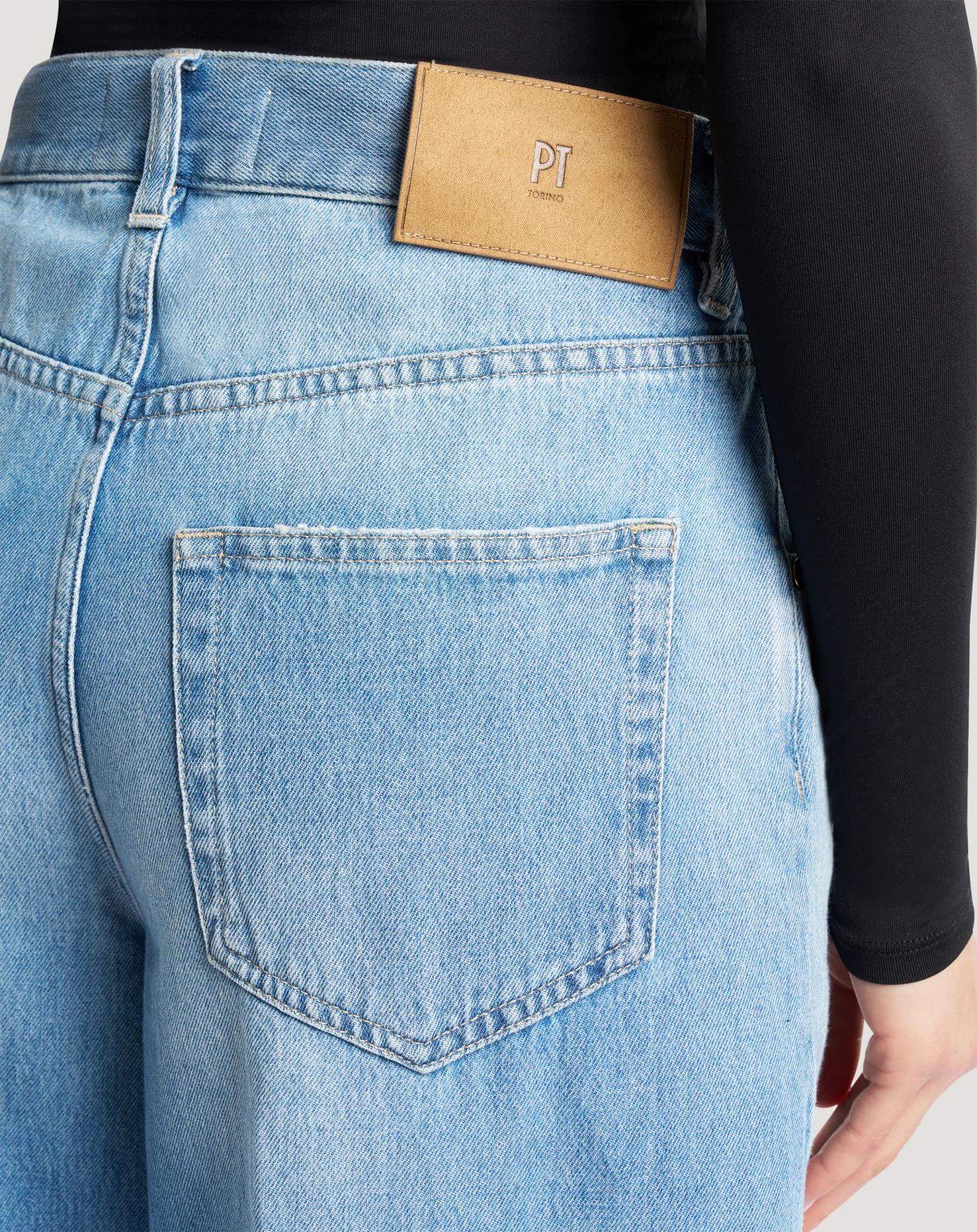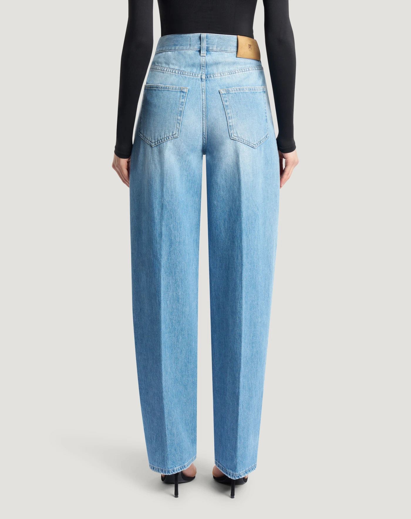 Jeans in cotton denim, a firm, medium weight (10 oz) fabric featuring a light wash with obvious shading in the front. With a high waist, carrot fit and pressed crease, they will add an urban, tailored touch to your everyday outfits.