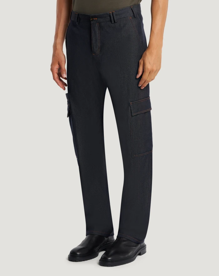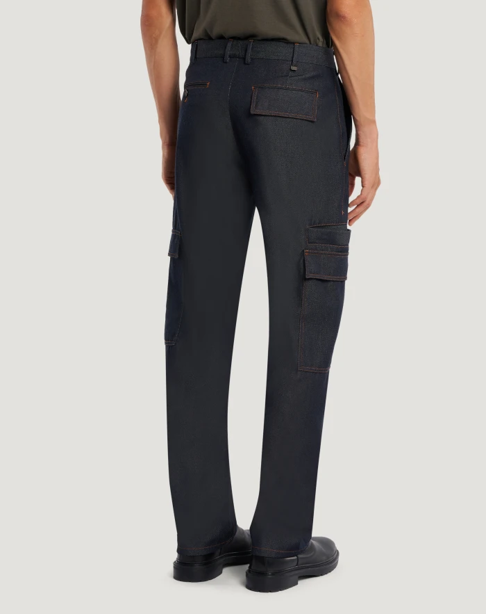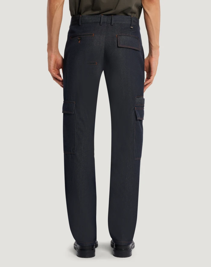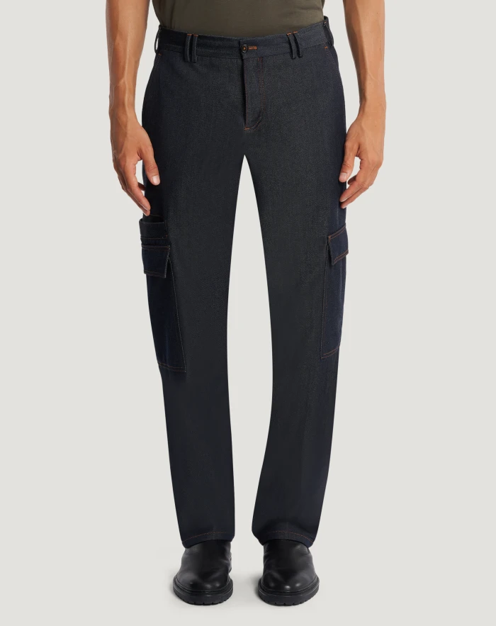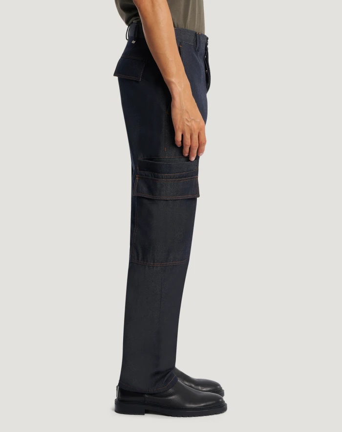 Trousers in wool and cotton, a refined, durable and contemporary fabric with a denim effect.The tailored version of the classic cargo trousers, with side pockets and pressed crease, combines comfort and style in a versatile and sophisticated garment.