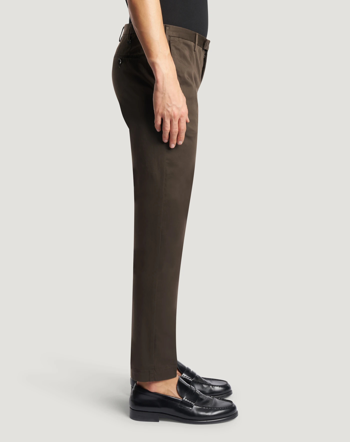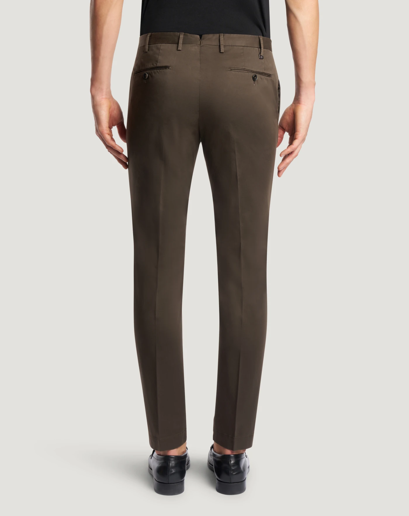 Trousers in a light, soft stretch satin featuring a smooth and slightly shiny surface. Enriched by an elastic component that increases comfort and freedom of movement.The garment is delivered unstitched, so that it can be finished to suit your length and style through simple tailoring. In the brown variant for sophisticated seasonal looks.