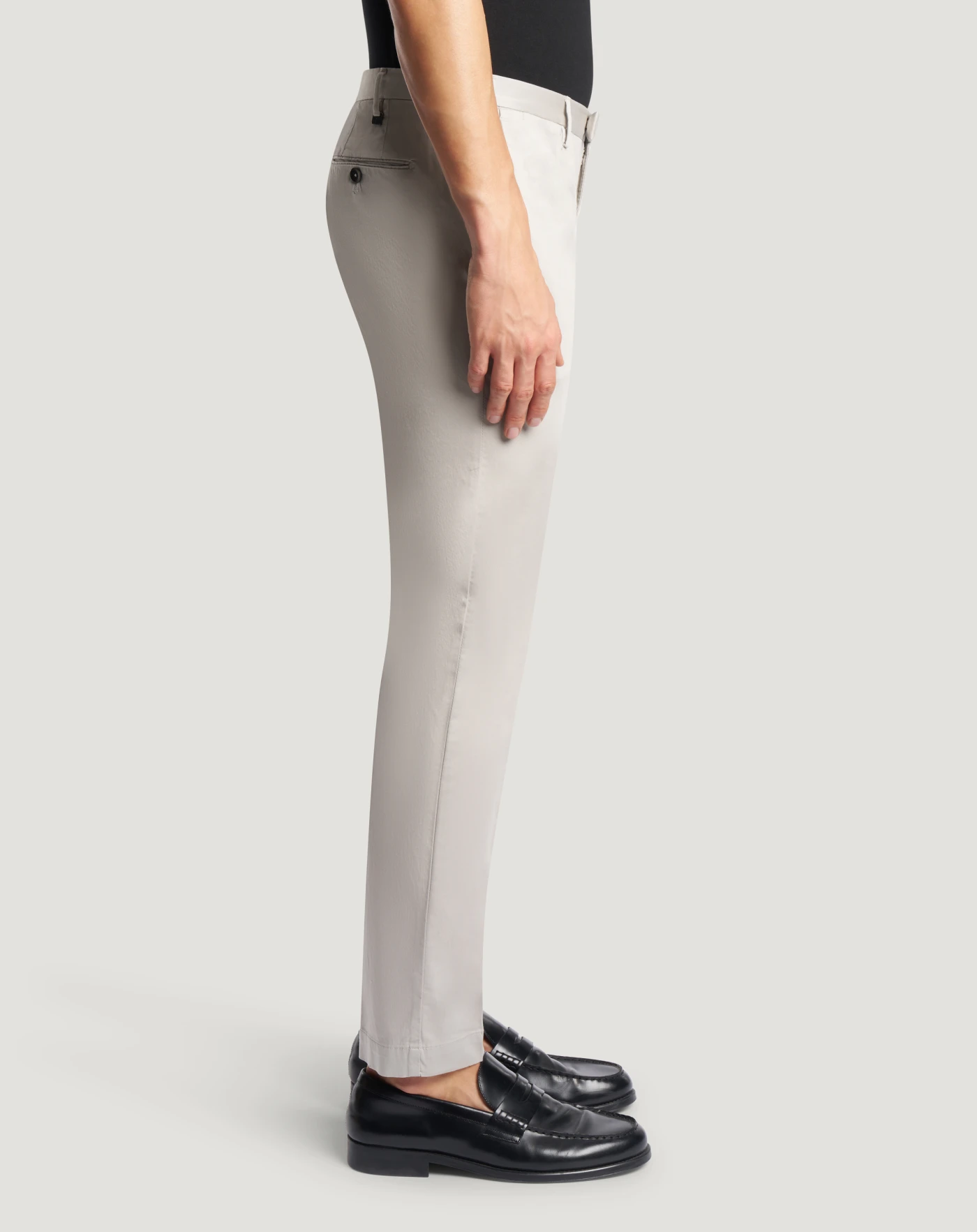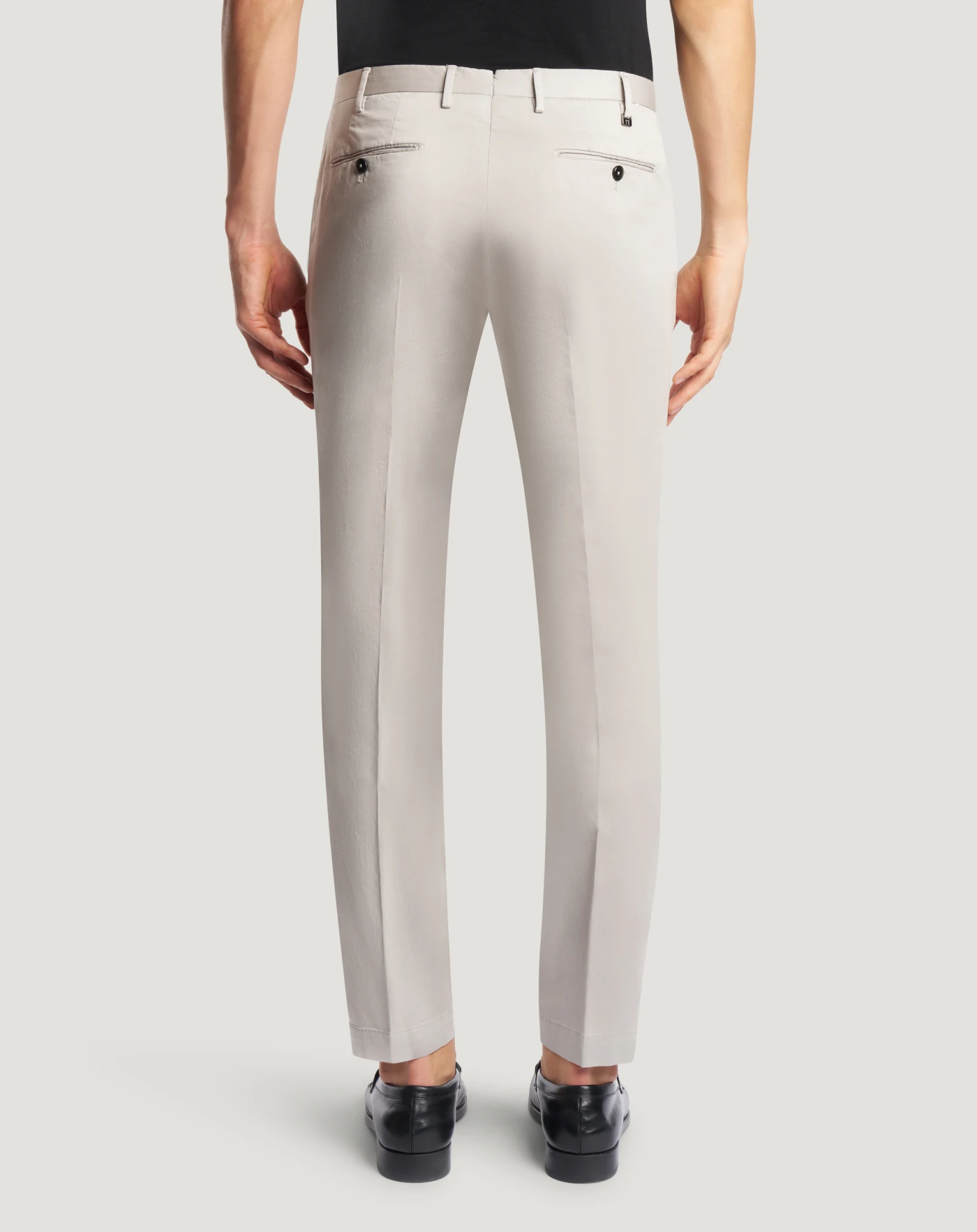 Trousers in a light, soft stretch satin featuring a smooth and slightly shiny surface. Enriched by an elastic component that increases comfort and freedom of movement.The garment is delivered unstitched, so that it can be finished to suit your length and style through simple tailoring. Choose grey to give a contemporary touch.