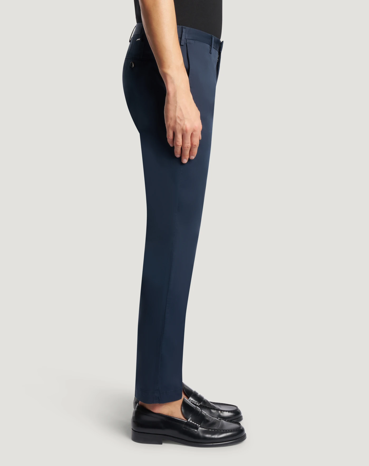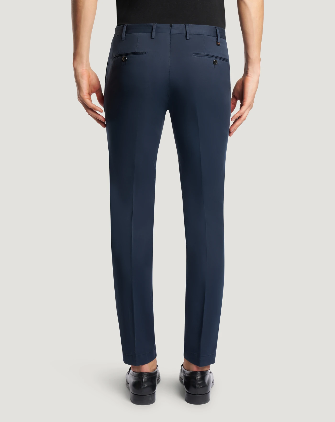 Trousers in a light, soft stretch satin featuring a smooth and slightly shiny surface. Enriched by an elastic component that increases comfort and freedom of movement.The garment is delivered unstitched, so that it can be finished to suit your length and style through simple tailoring. In navy blue for sophisticated seasonal looks.