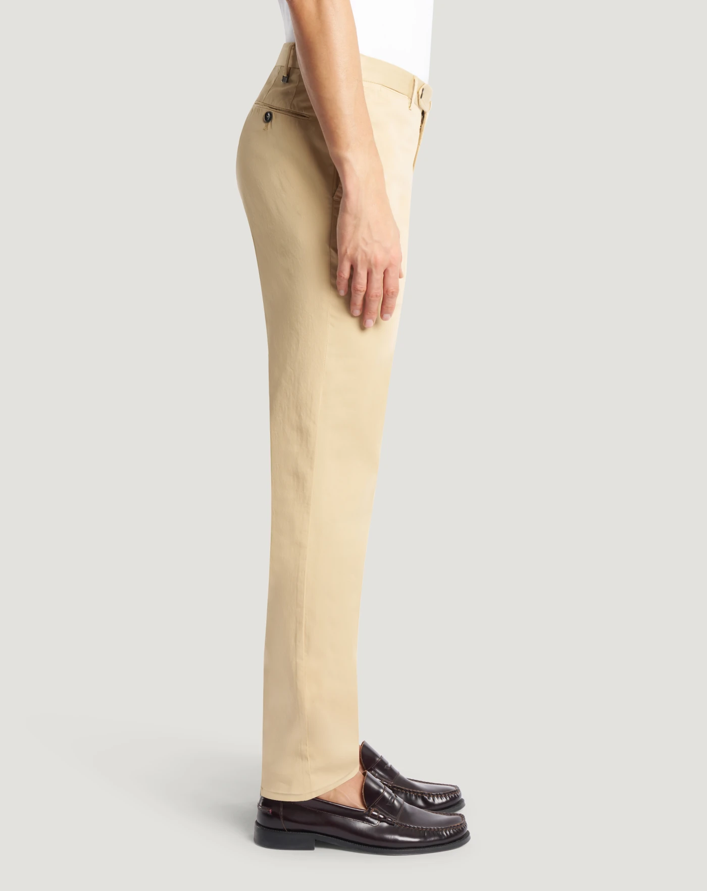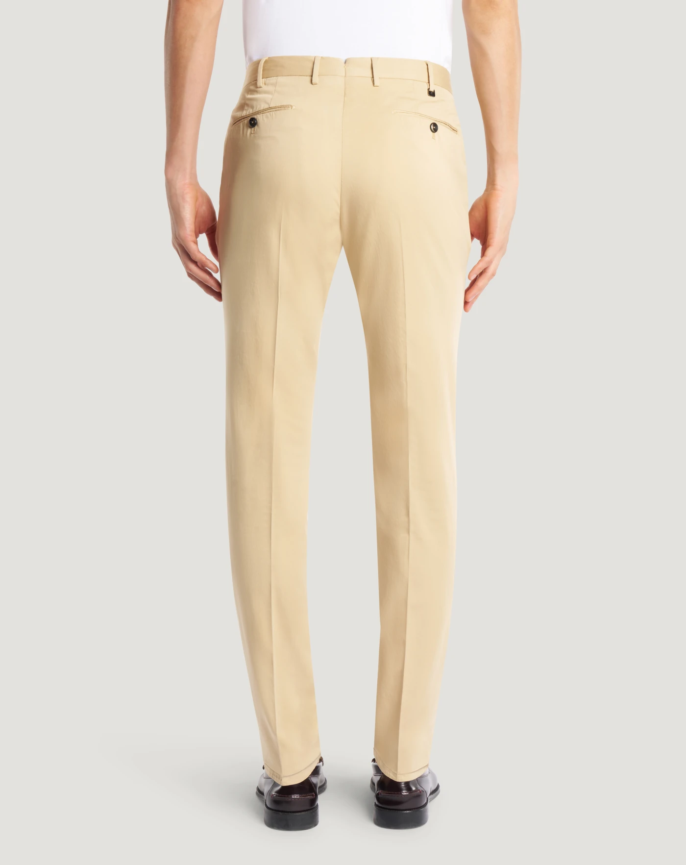 Silkochino trousers in cotton and silk, a garment dyed fabric that combines the comfort of stretch fibre with the elegant and refined appearance of silk.The garment is delivered unstitched, so that it can be finished to suit your length and style through simple tailoring. Choose beige for sophisticated seasonal looks.