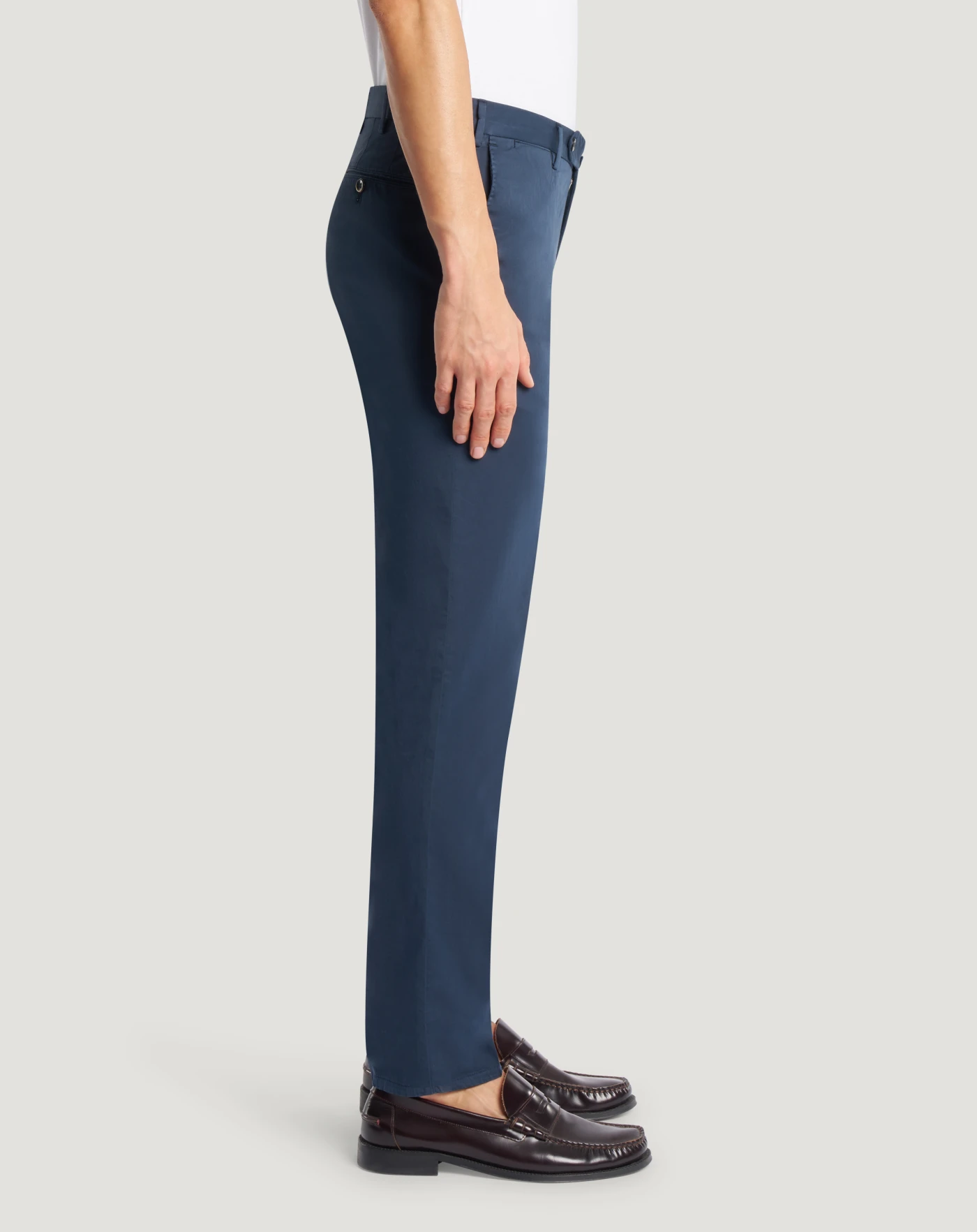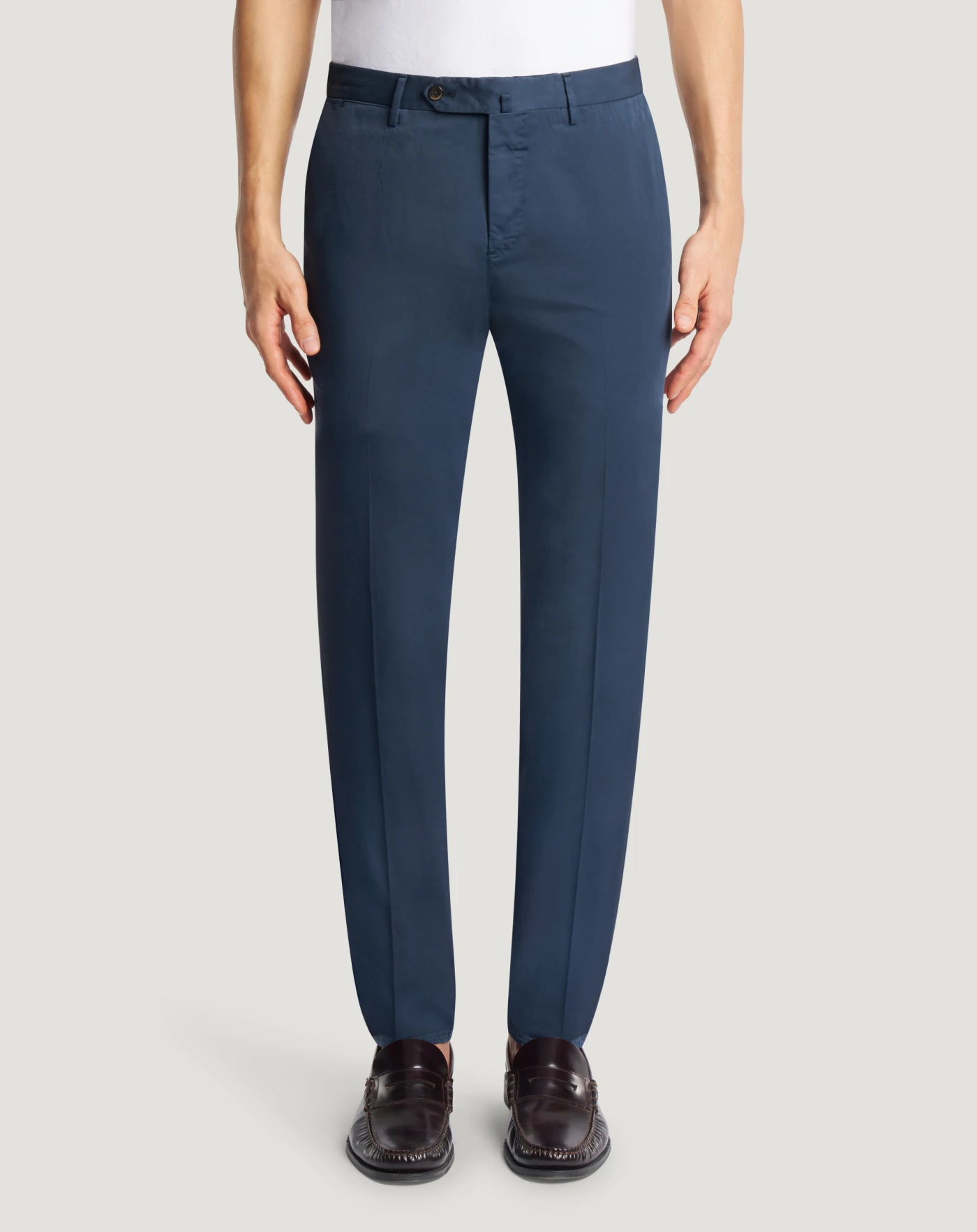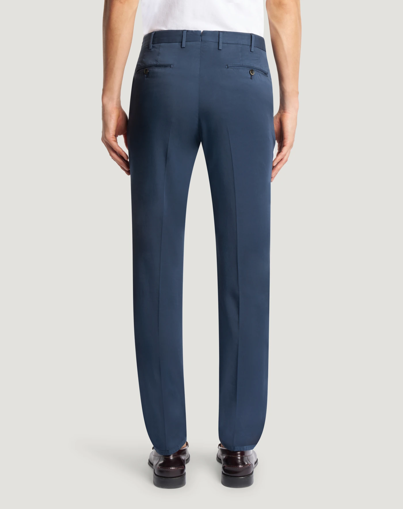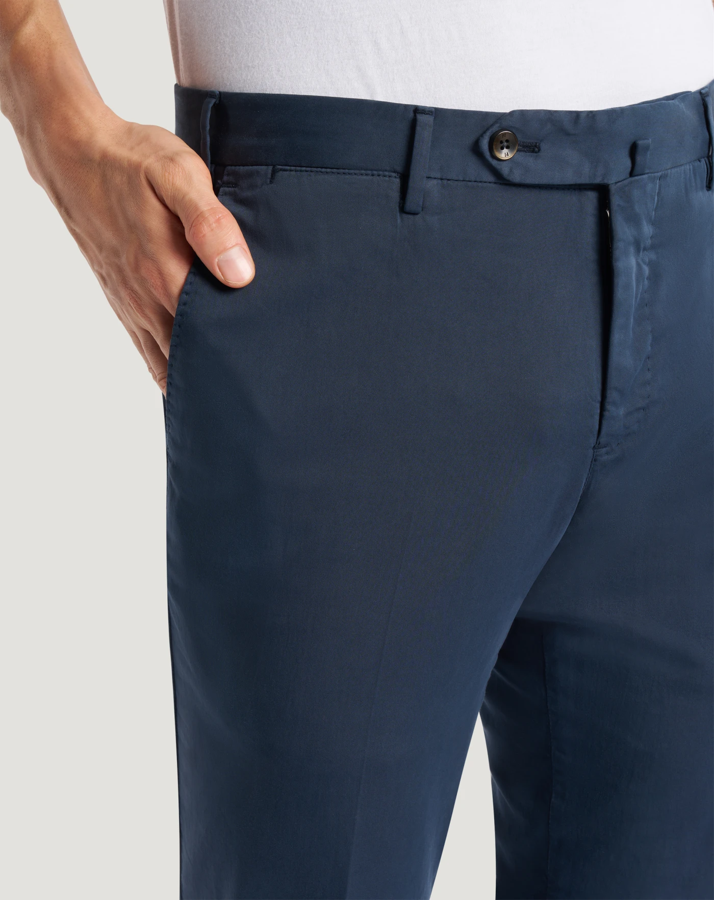 Silkochino trousers in cotton and silk, a garment dyed fabric that combines the comfort of stretch fibre with the elegant and refined appearance of silk.The garment is delivered unstitched, so that it can be finished to suit your length and style through simple tailoring. In the navy variant to create refined, impactful looks.