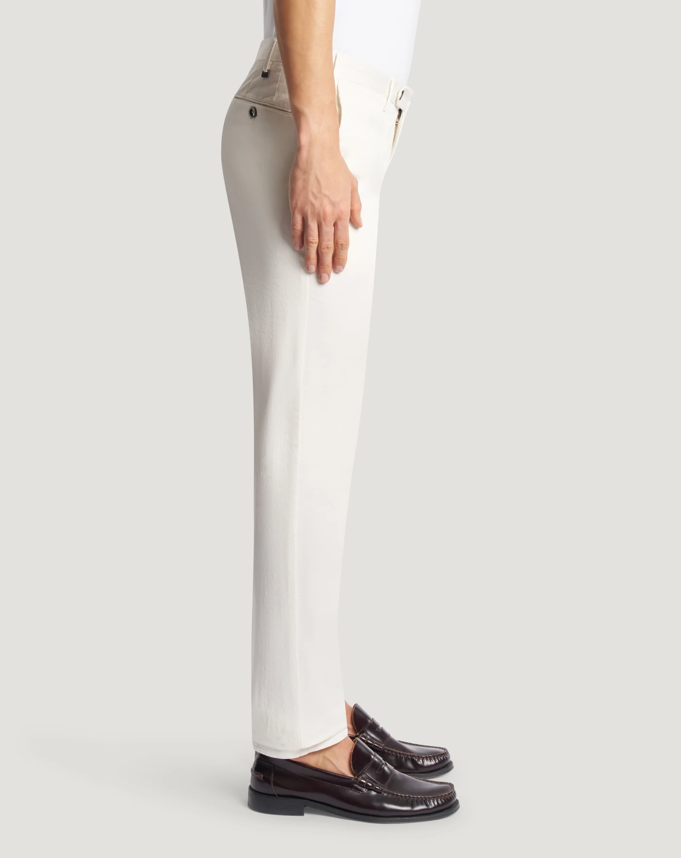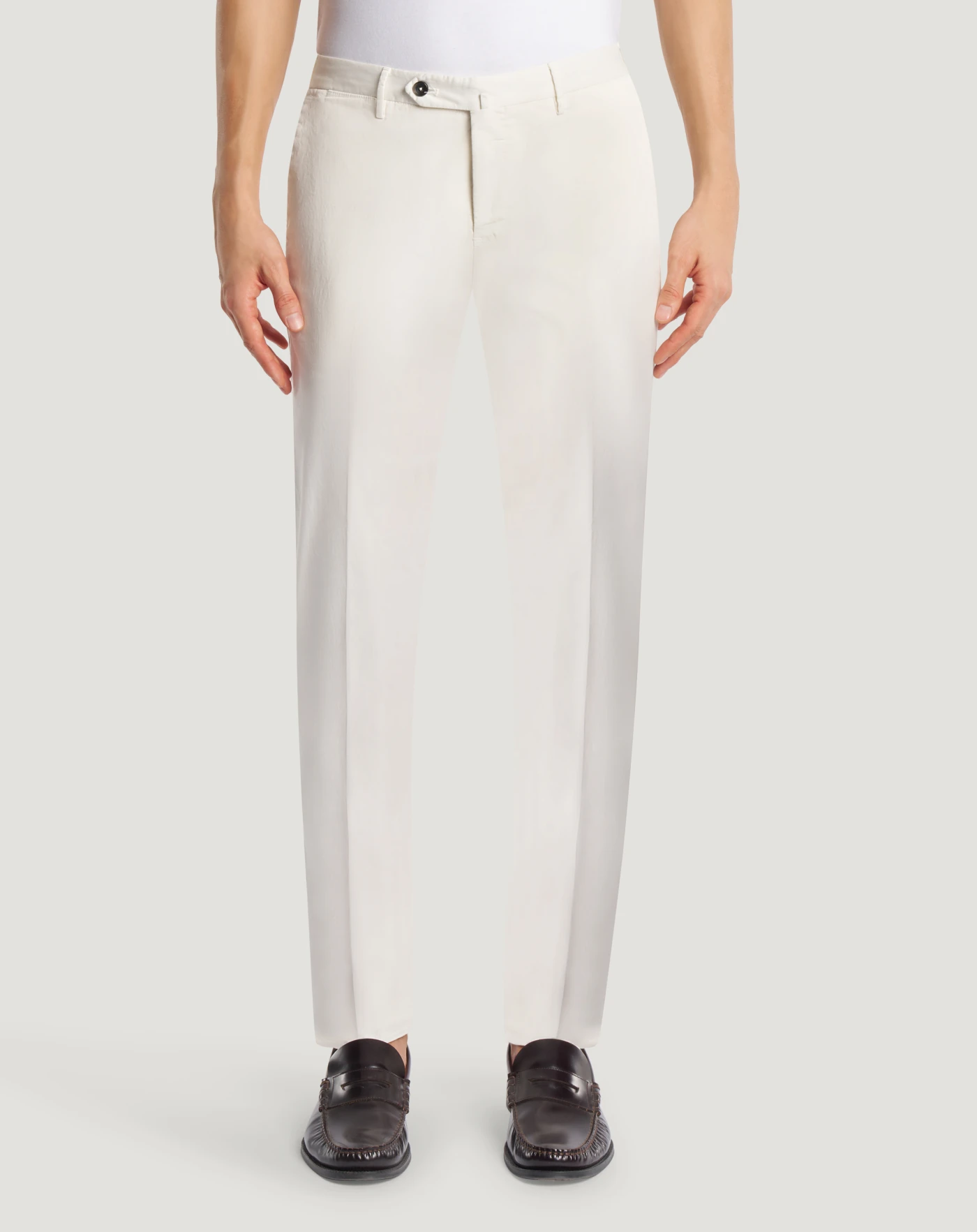 Trousers in stretch cotton gabardine, a soft, durable and easy-to-pair everyday fabric. The garment is delivered unstitched, so that it can be finished to suit your length and style through simple tailoring. The white variant will add a contemporary touch to your style.
