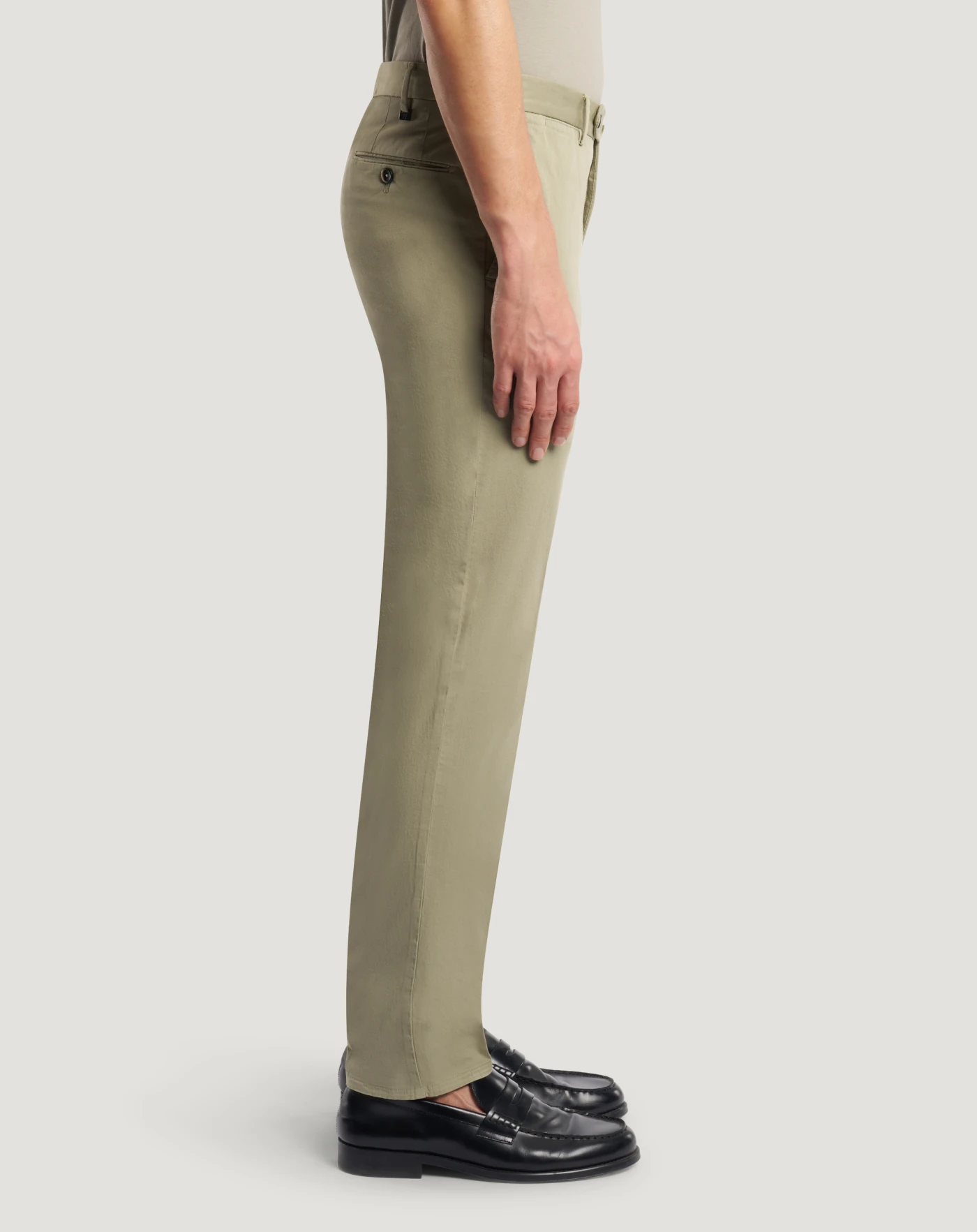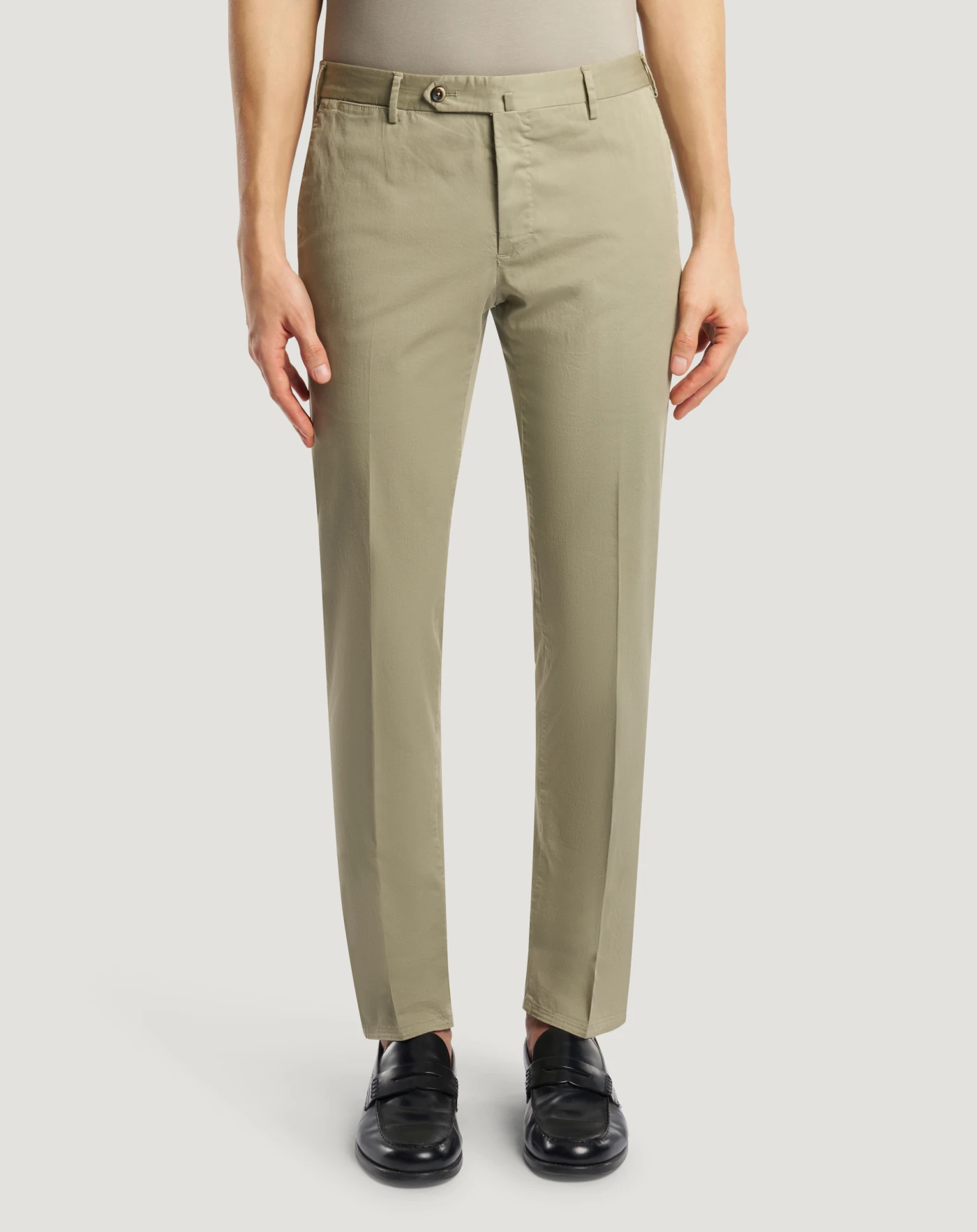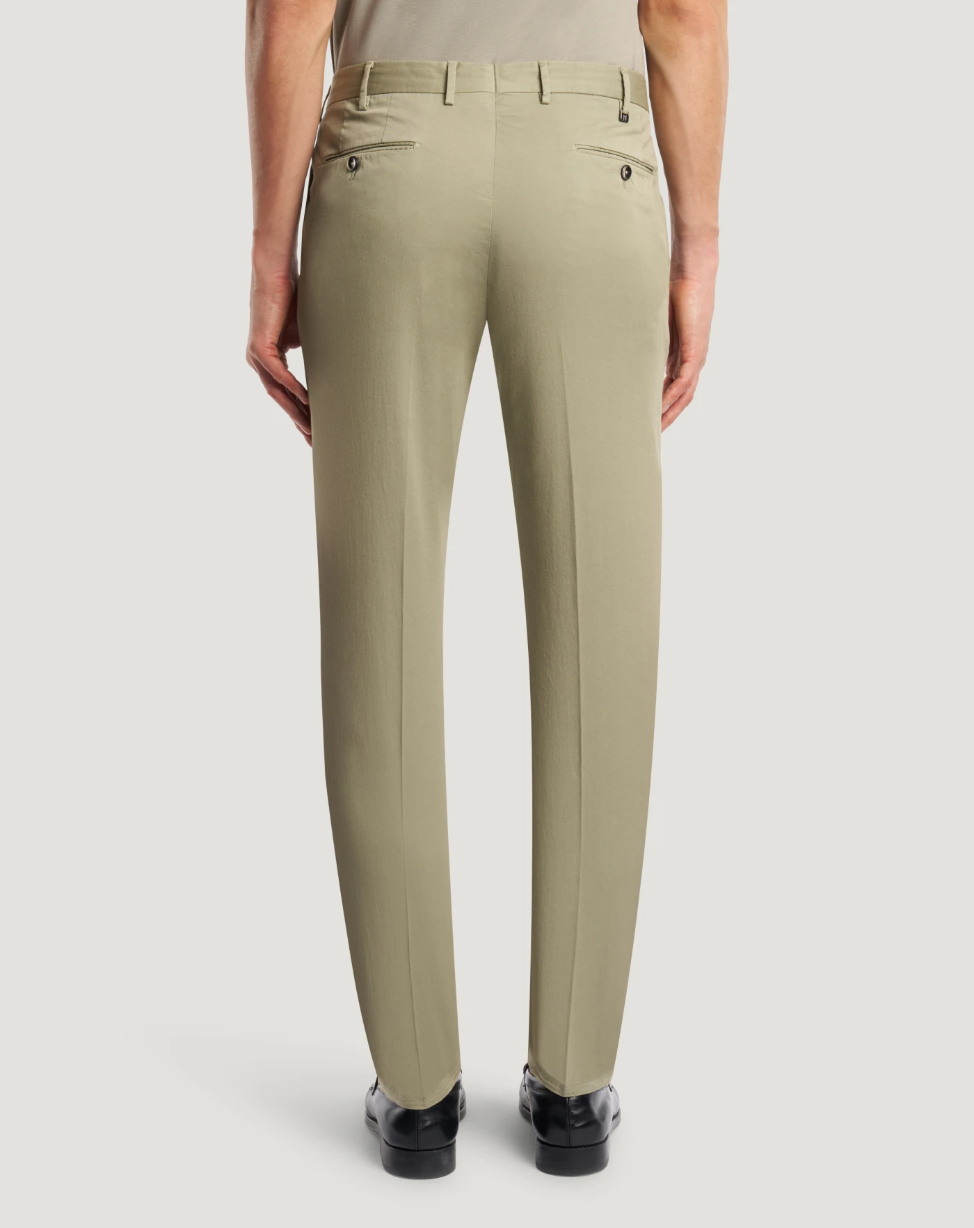 Trousers in stretch cotton gabardine, a soft, durable and easy-to-pair everyday fabric. The garment is delivered unstitched, so that it can be finished to suit your length and style through simple tailoring. Choose sage green for a unique note of colour.