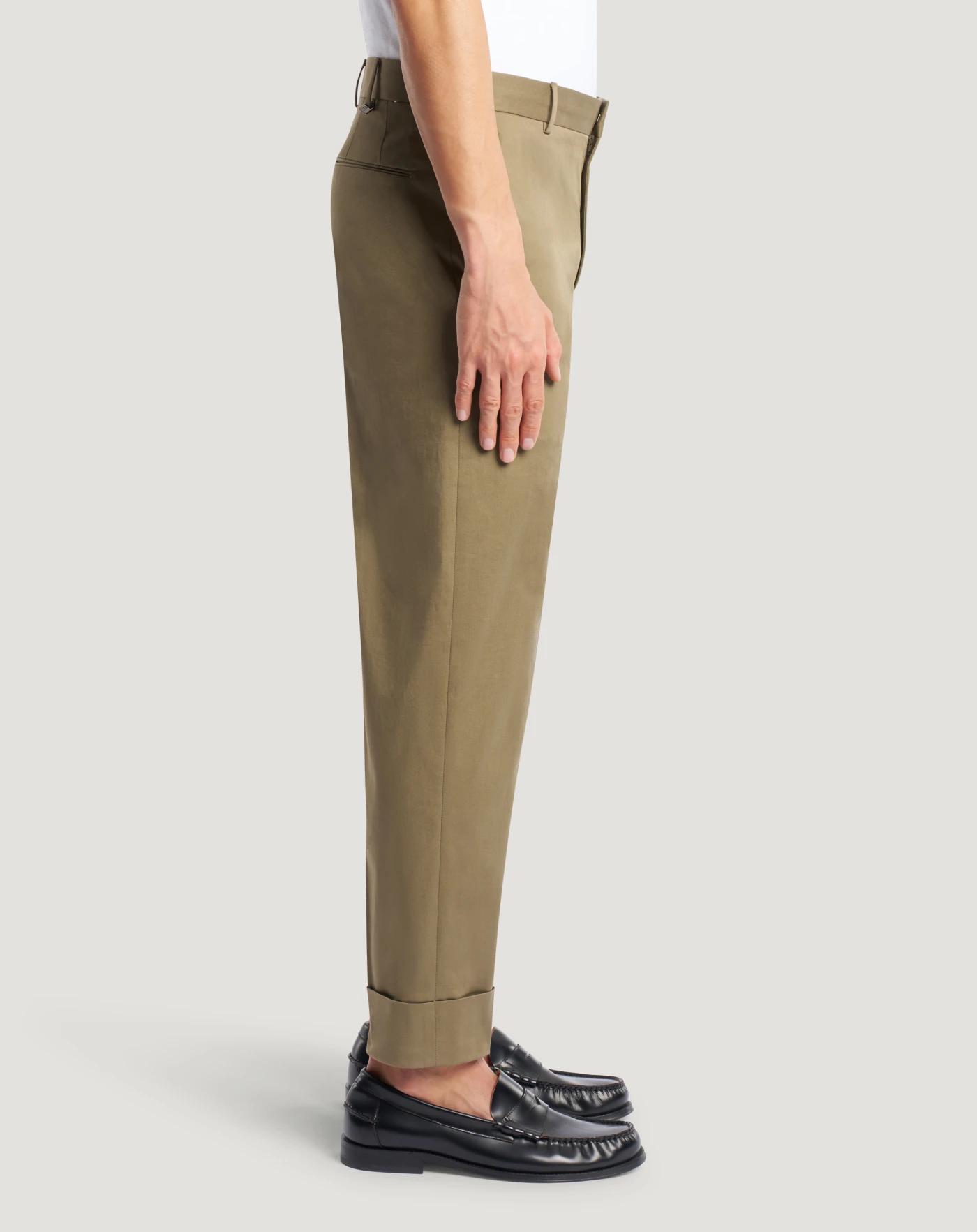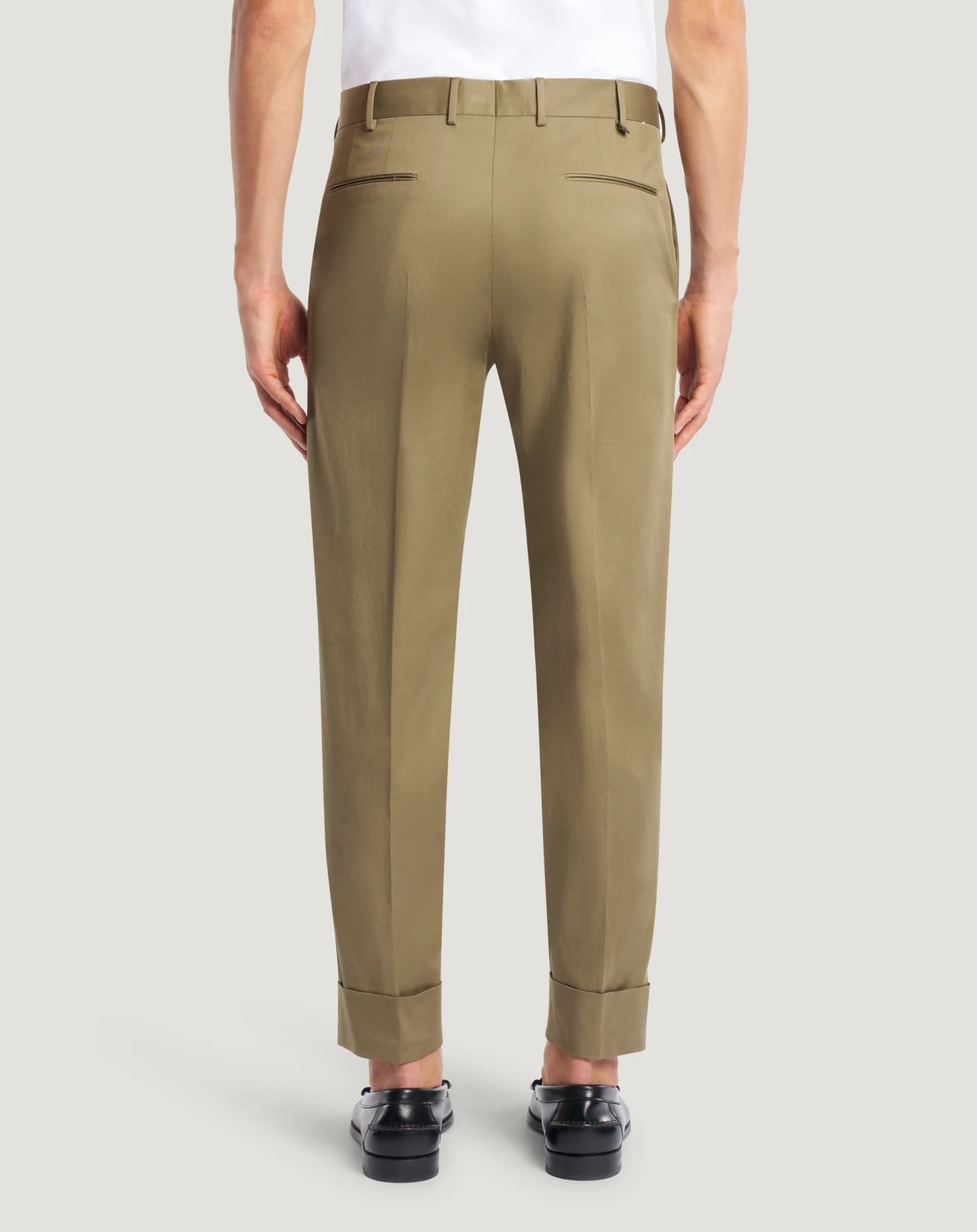 Trousers in stretch twill, a fabric with a fine and regular diagonal weave and a clean, elegant look.They have a slightly carrot fit with turn-ups: choose the green variant to give your style a touch of colour.