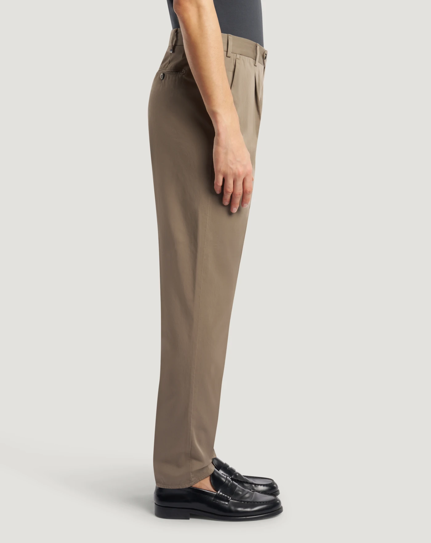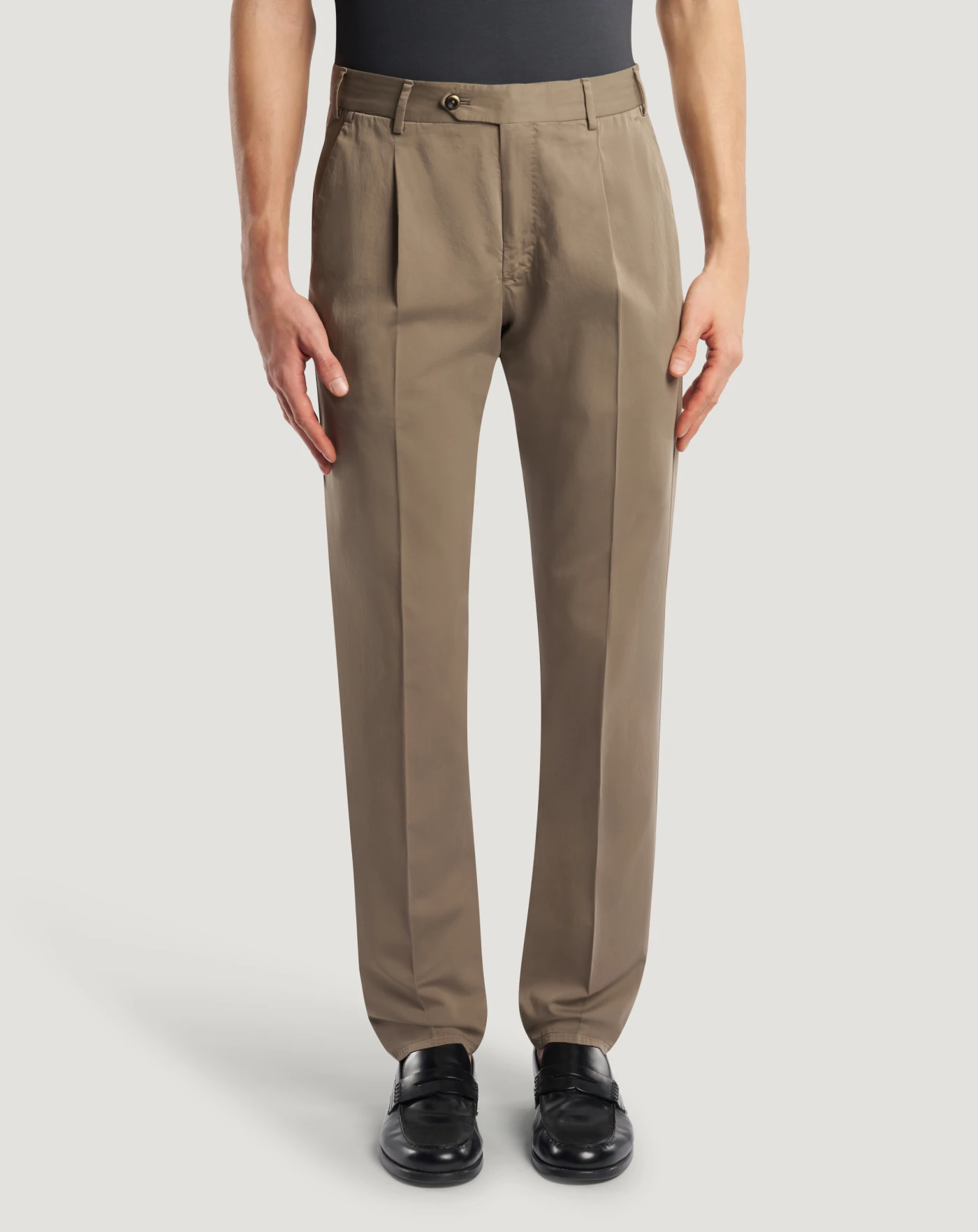 Silkochino trousers in cotton and silk, a garment dyed fabric that combines the comfort of stretch fibre with the elegant and refined appearance of silk.The garment is delivered unstitched, so that it can be finished to suit your length and style through simple tailoring. The beige variant is a versatile base for myriad looks.