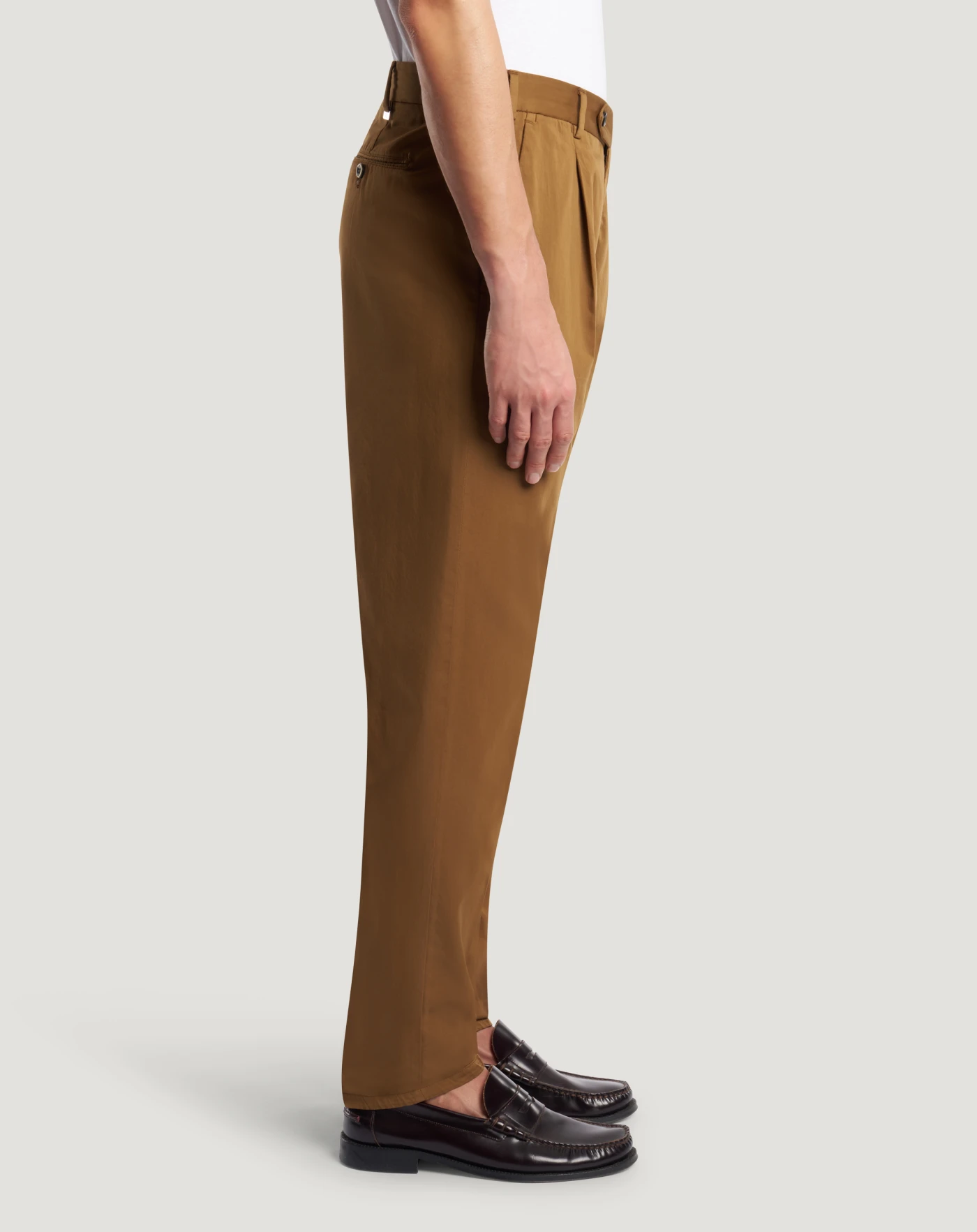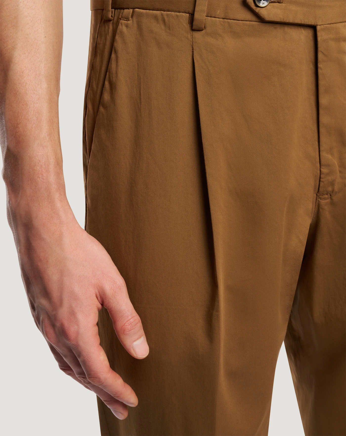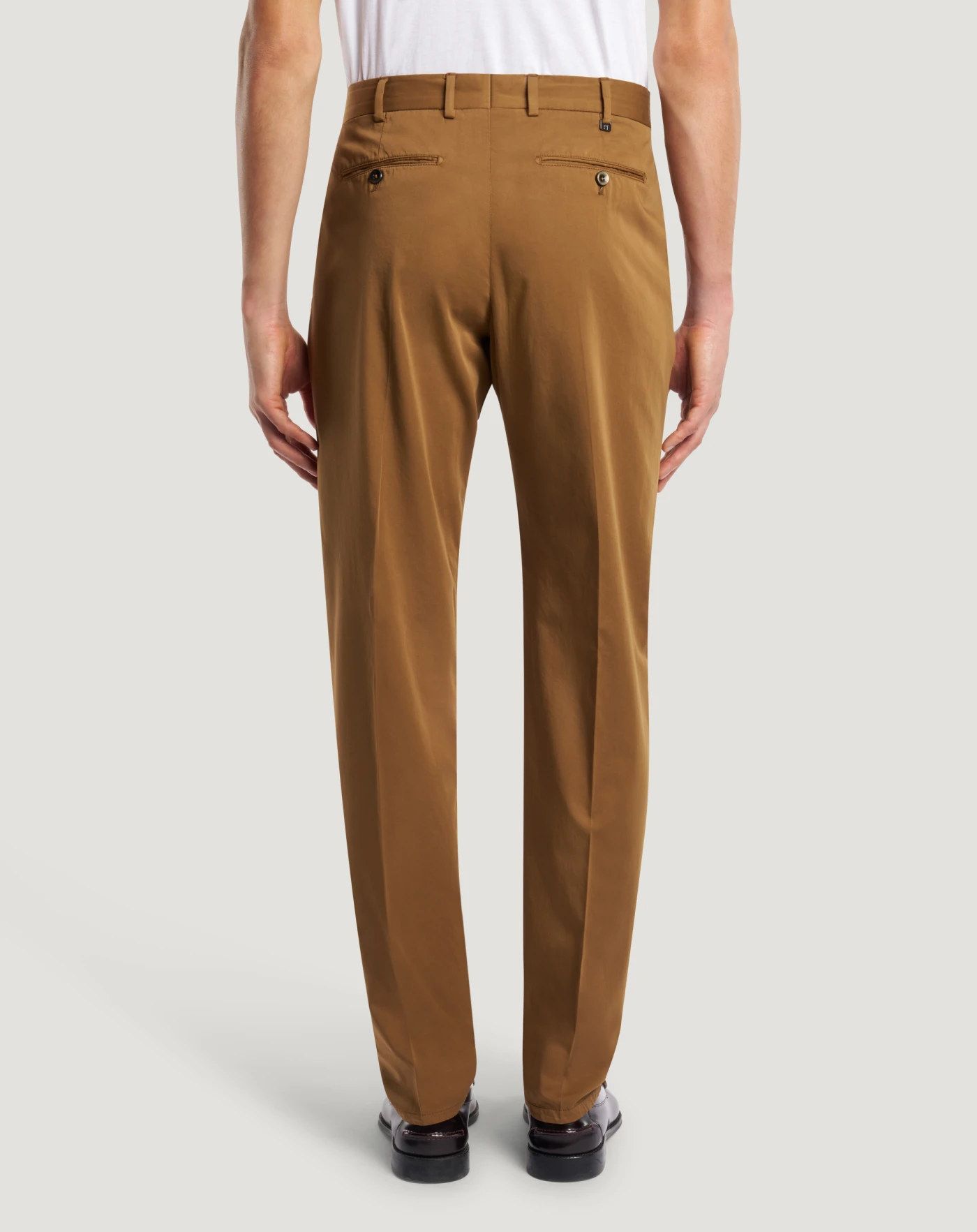 Silkochino trousers in cotton and silk, a garment dyed fabric that combines the comfort of stretch fibre with the elegant and refined appearance of silk.The garment is delivered unstitched, so that it can be finished to suit your length and style through simple tailoring. The beige variant is a versatile base for myriad looks.