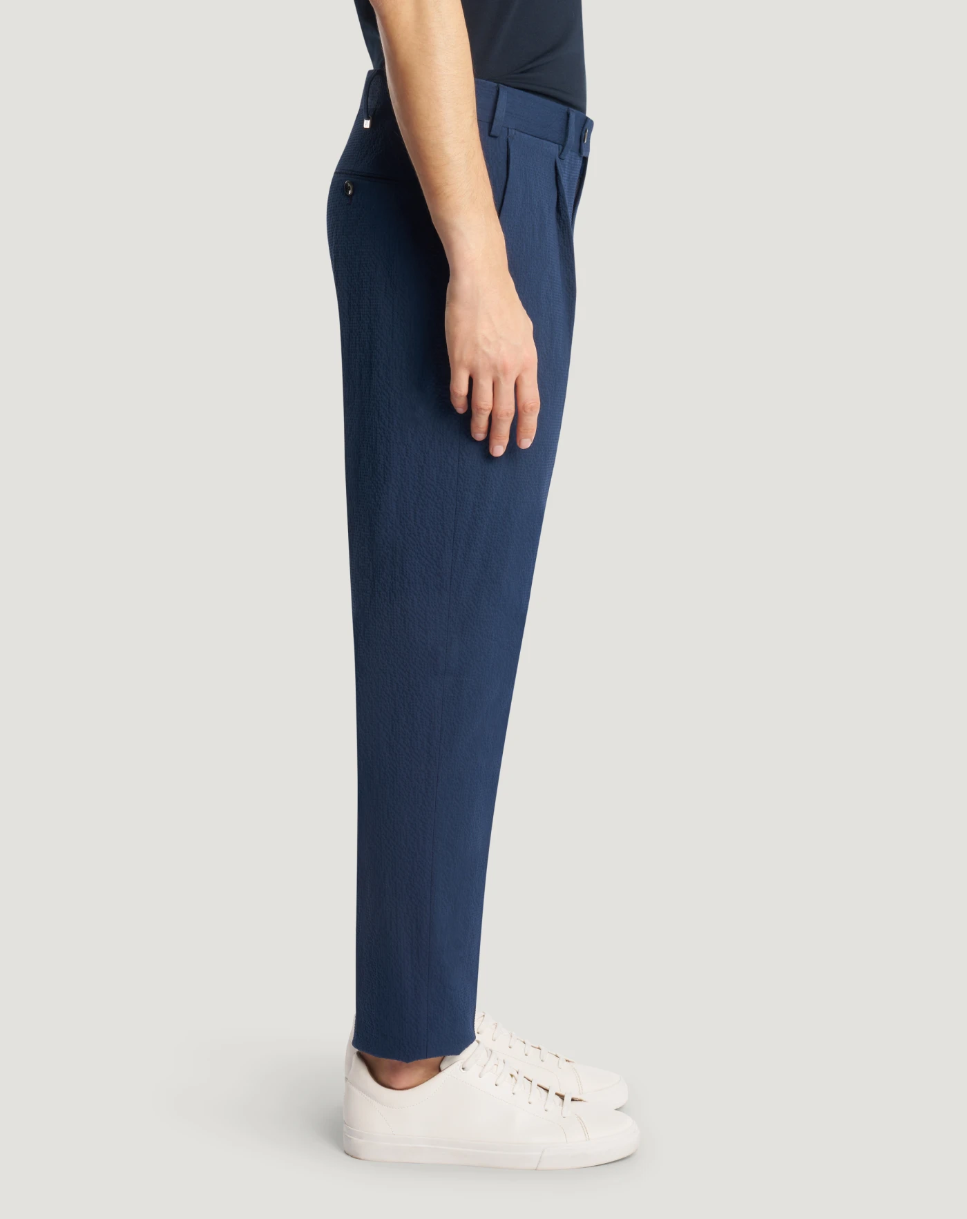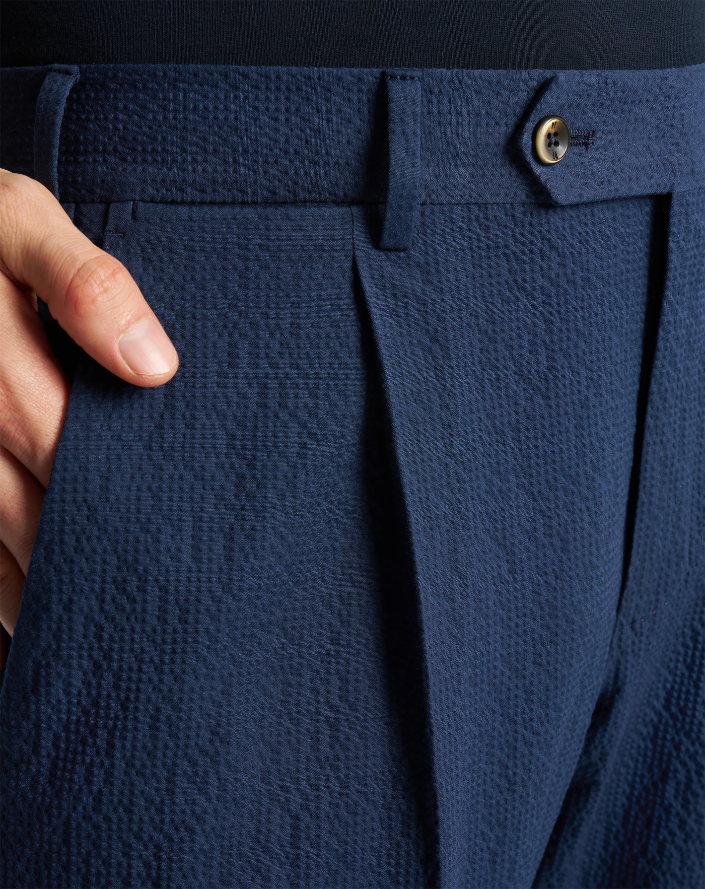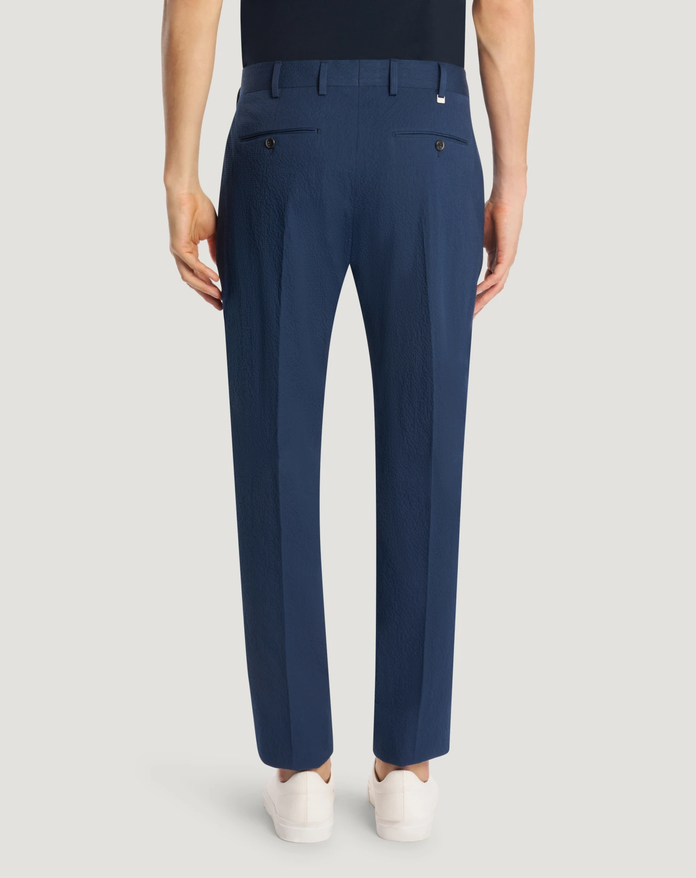 Trousers in stretch cotton seersucker that combines the typical wavy, three-dimensional look of seersucker with a softer, more comfortable finish.The garment is delivered unstitched, so that it can be finished to suit your length and style through simple tailoring.With a pleat at the front and comfortable fit, they are ideal for your off-duty looks.
