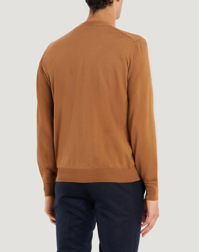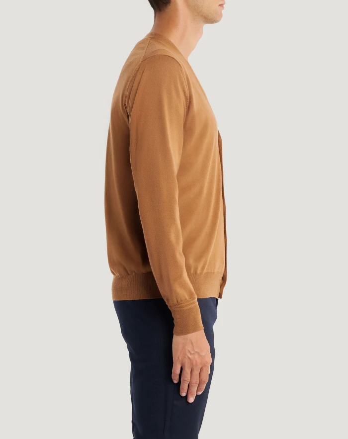 Cardigan in pure wool with stocking-stitch finish and fineness 16 for a very light and comfortable garment.Its essential and versatile design can complete formal and casual looks. In the camel brown variant for elegance that stands out.