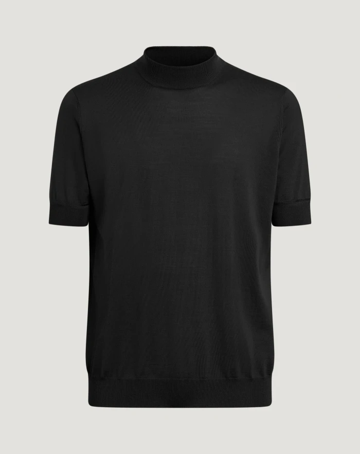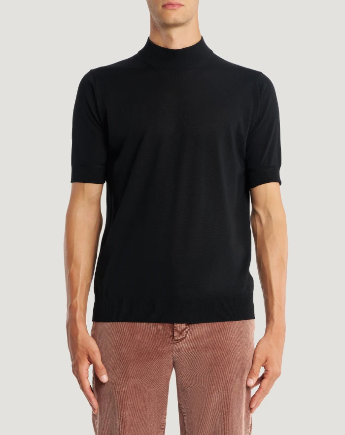 Polo neck jumper in pure wool with stocking-stitch finish and fineness 16 for a very light, comfortable garment.With a slim fit and short sleeves, it has an essential and versatile design that completes both formal and casual looks. Choose the black variant to give your style a refined touch.